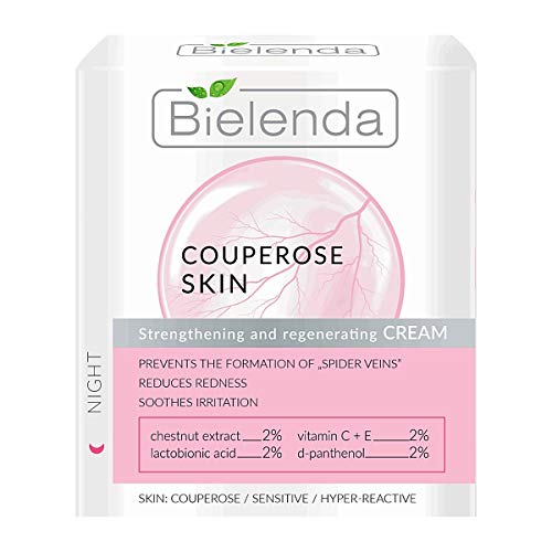 Couperose Skin - Strengthening and Regenerating Cream by Bielenda. Night face cream. It comes from a special line of cosmetics created for the care of capillary skin. It prevents the formation of new "spiders" while reducing redness. The cream formula has been enriched with lactobionic acid, vitamin C + E complex, D-Panthenol and chestnut. Thanks to which it has anti-swelling, anti-inflammatory and soothing effects. In addition, it is easily absorbed, strongly moisturizes and regenerates while reducing the visibility of dilated capillaries. It also increases the skin's resistance to damage, gently soothes and evens its color. Applying regularly every evening, the skin will become soft and perfectly regenerated. The product was placed in a handy 50 ml jar.