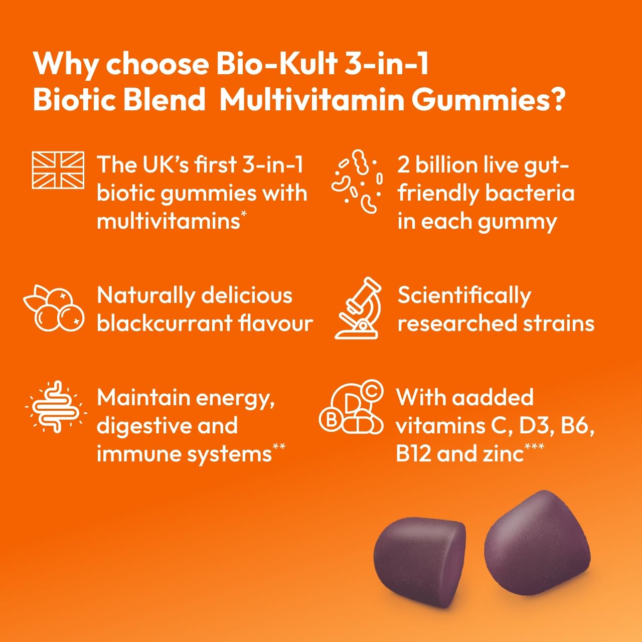 - Unique pre + pro + post formula: the UK's 3-in-1 biotic gummies with multivitamins and scientifically researched strains