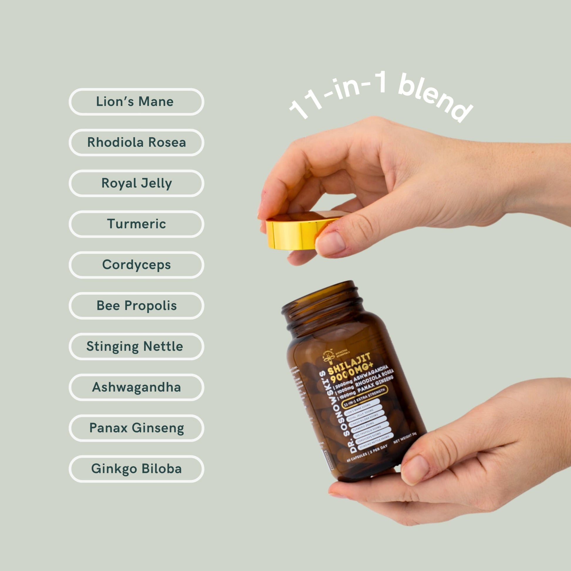 BioActive Shilajit Blend by Dr. Sosnowski's with Ashwagandha, Rhodiola Rosea, Lions Mane, Panax Ginseng, Royal Jelly, Ginkgo Biloba, Turmeric, Bee Propolis, Cordyceps and Stinging Nettle| 60 Capsules