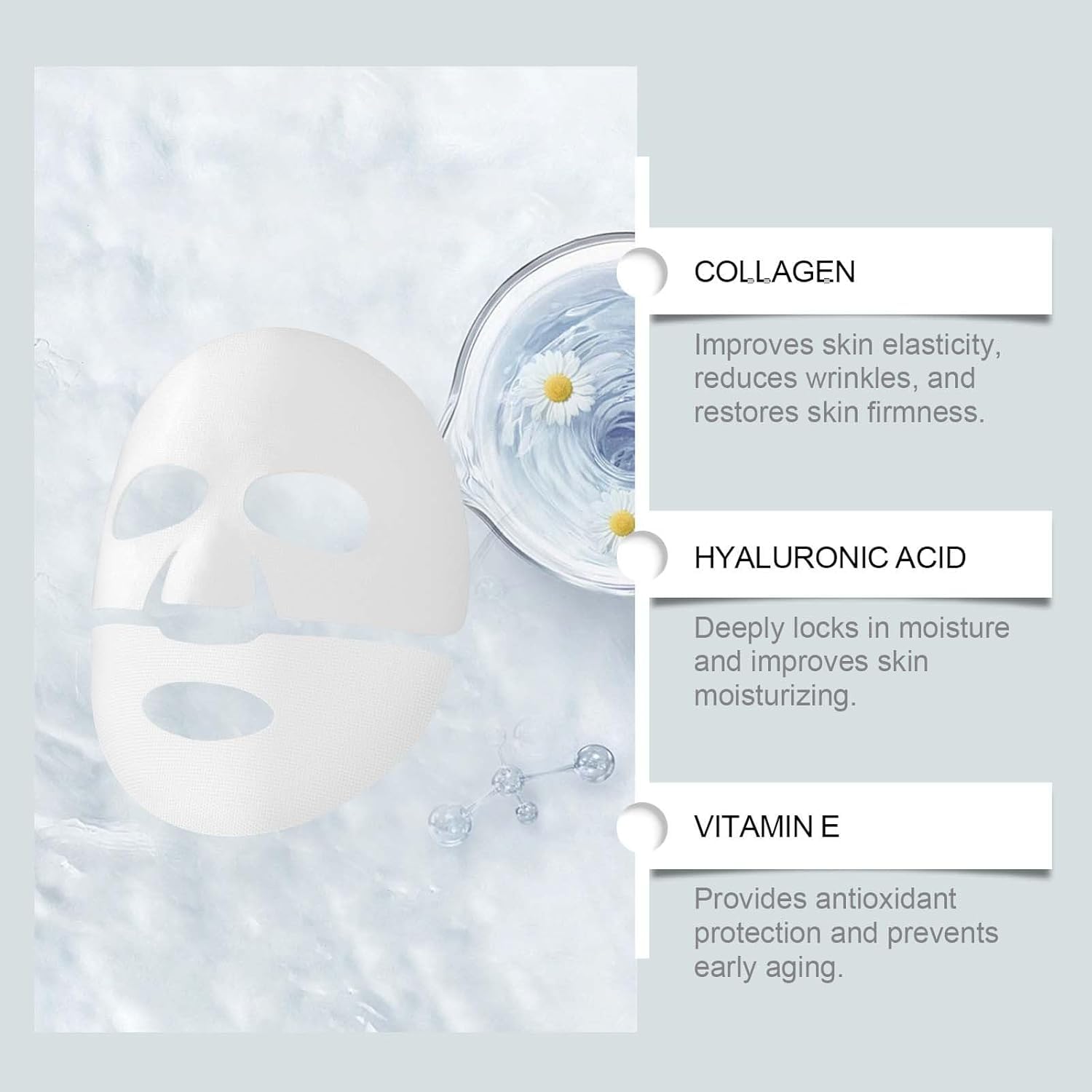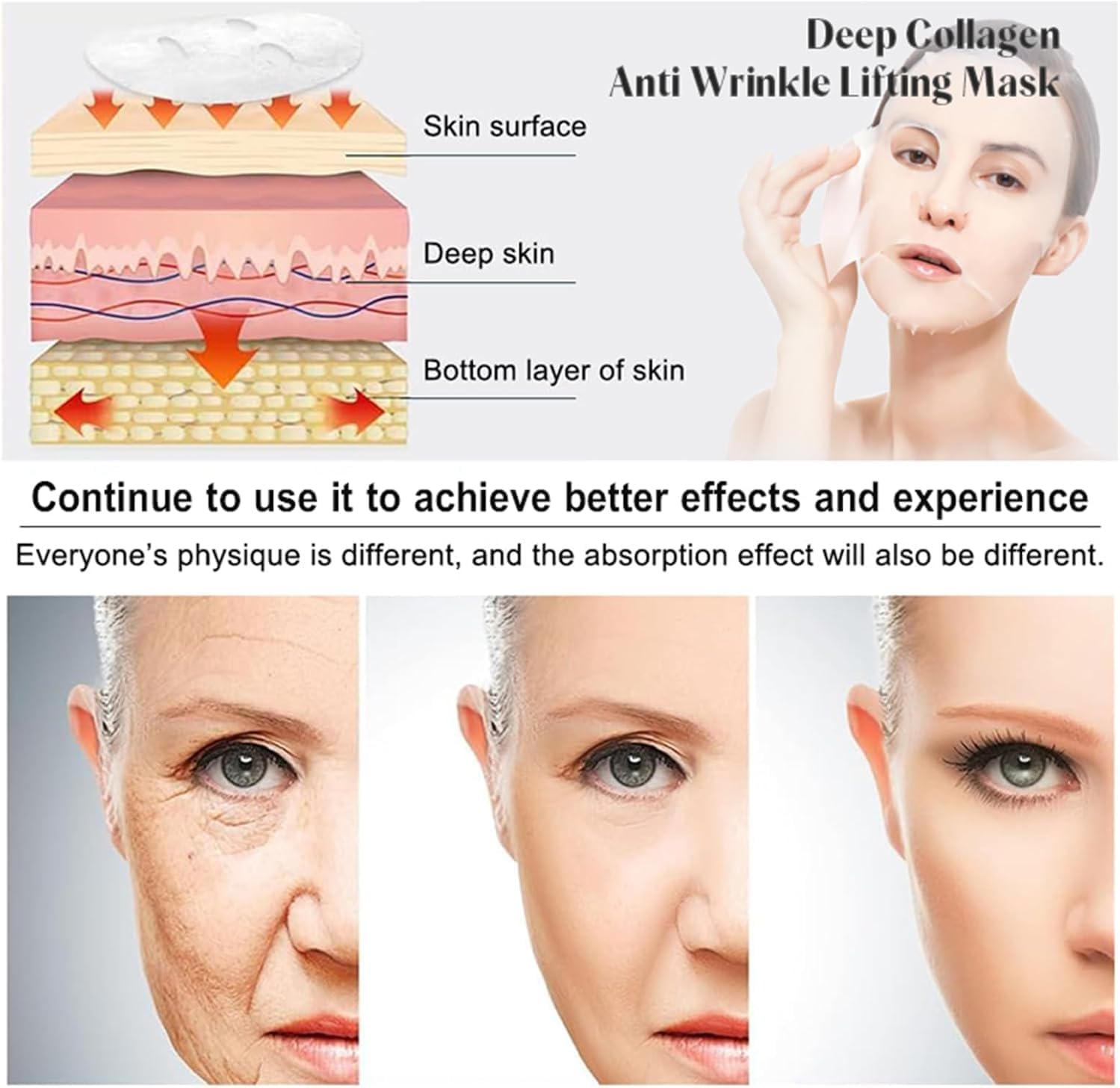 The oligohyaluronic acid in the collagen face mask provides better hydration than regular hyaluronic acid.Face masks beauty quickly moisturizes the deeper layers of the skin, firms and lifts sagging facial muscles, giving you a healthy and natural skin color.Steps for usage: