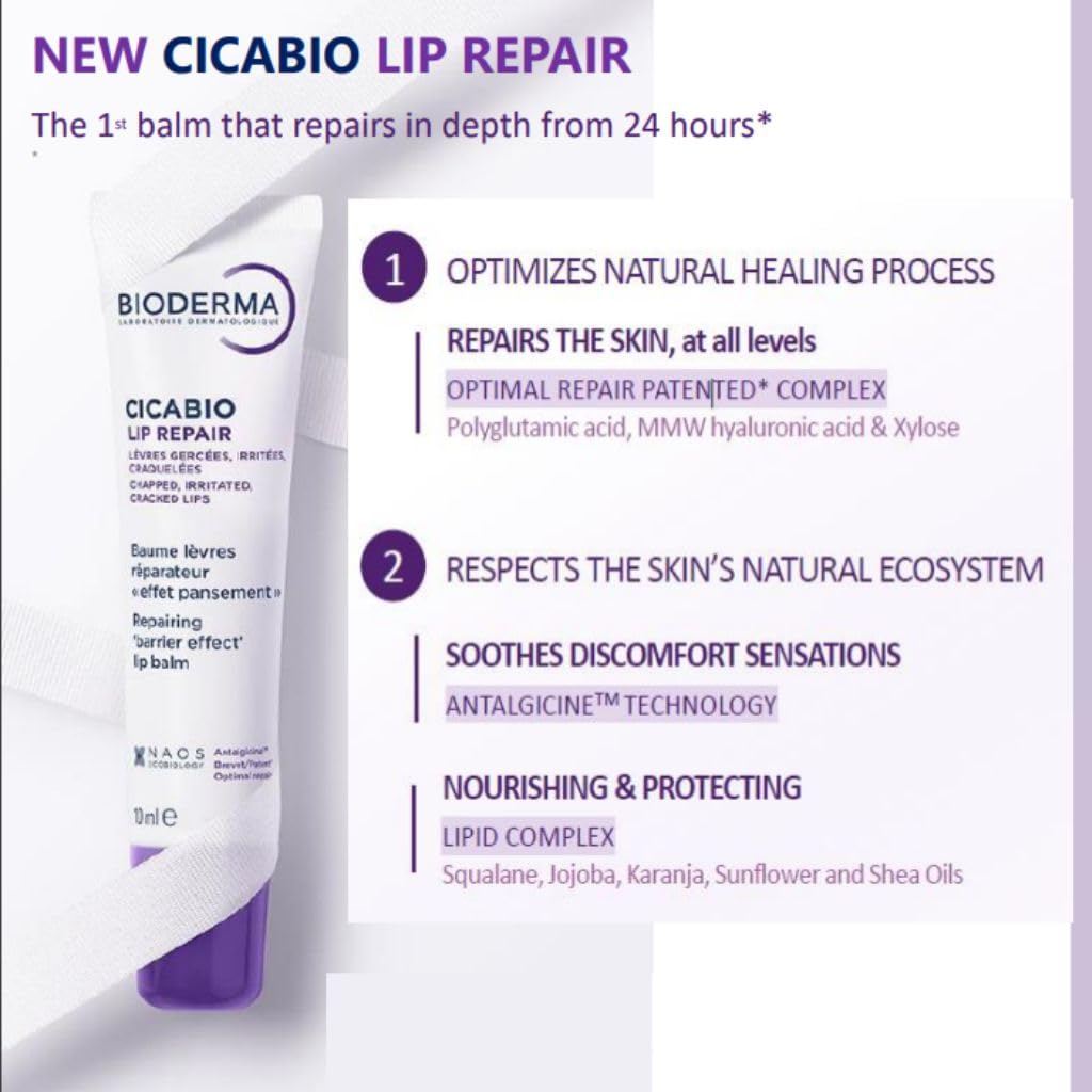 What is Bioderma Cicabio Lip Repair good for? Bioderma Cicabio Lip Repair is a clinically proven balm designed to restore and protect damaged lips. With its immediate moisturizing and softening effects, this balm enhances lip hydration by 51% within 2 hours of application and provides long-lasting hydration for up to 8 hours. Regular use strengthens and regenerates lips, ensuring they feel soft, nourished, and resilient over time. Free from fragrances, silicones, and colorants, this balm is ideal for sensitive lips needing intensive care. Key Benefits - Immediate Restoration: Instantly restores and softens damaged lips, providing visible relief. - Long-Lasting Hydration: Boosts moisture levels by 51% in 2 hours and hydrates for up to 8 hours. - Strengthens Lips: Regular use regenerates and strengthens lips for durable protection. Key Ingredients - Jojoba Oil: Provides deep hydration and soothes lips. - Karanja Oil: Supports natural regeneration and protects lips. - Sunflower Oil: Nourishes and softens the delicate lip skin. - Shea Oil: Locks in moisture and promotes healing. Directions for Use - Apply to clean, dry lips as often as needed. Use consistently to restore and maintain lip health.More Info
