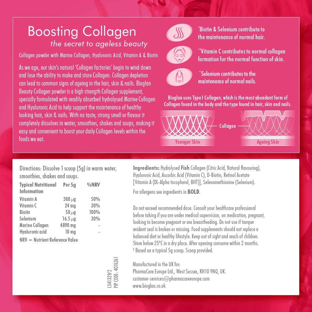 - unique formulation: bioglan beauty collagen powder is a high strength collagen supplement, specially formulated with readily absorbed hydrolyzed marine collagen and hyaluronic acid to help support the maintenance of healthy looking hair, skin & nails.