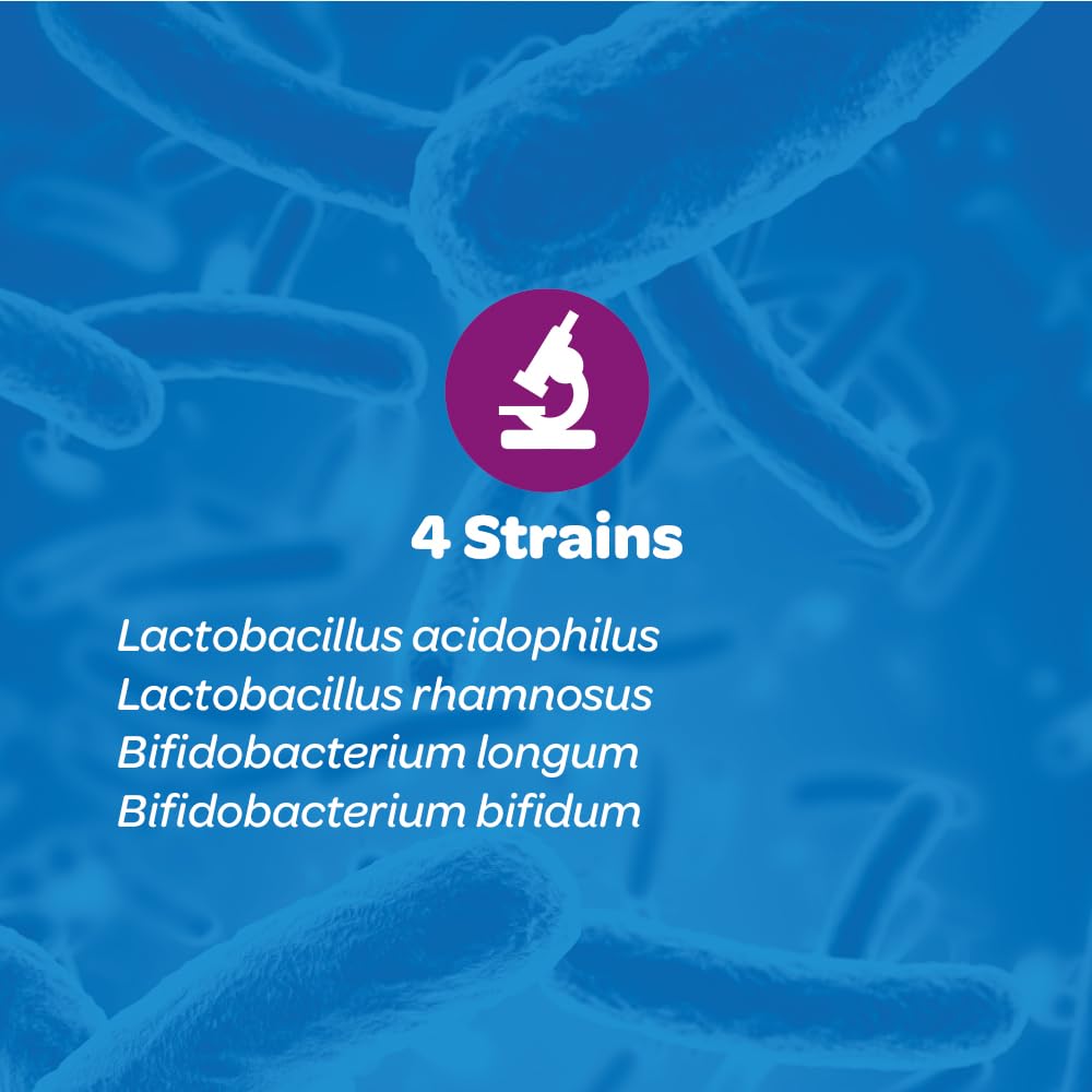 - 4 scientifically studied strains; Lactobacillus acidophilus, Lactobacillus rhamnosus, Bifidobacterium longum, Saccharomyces boulardii