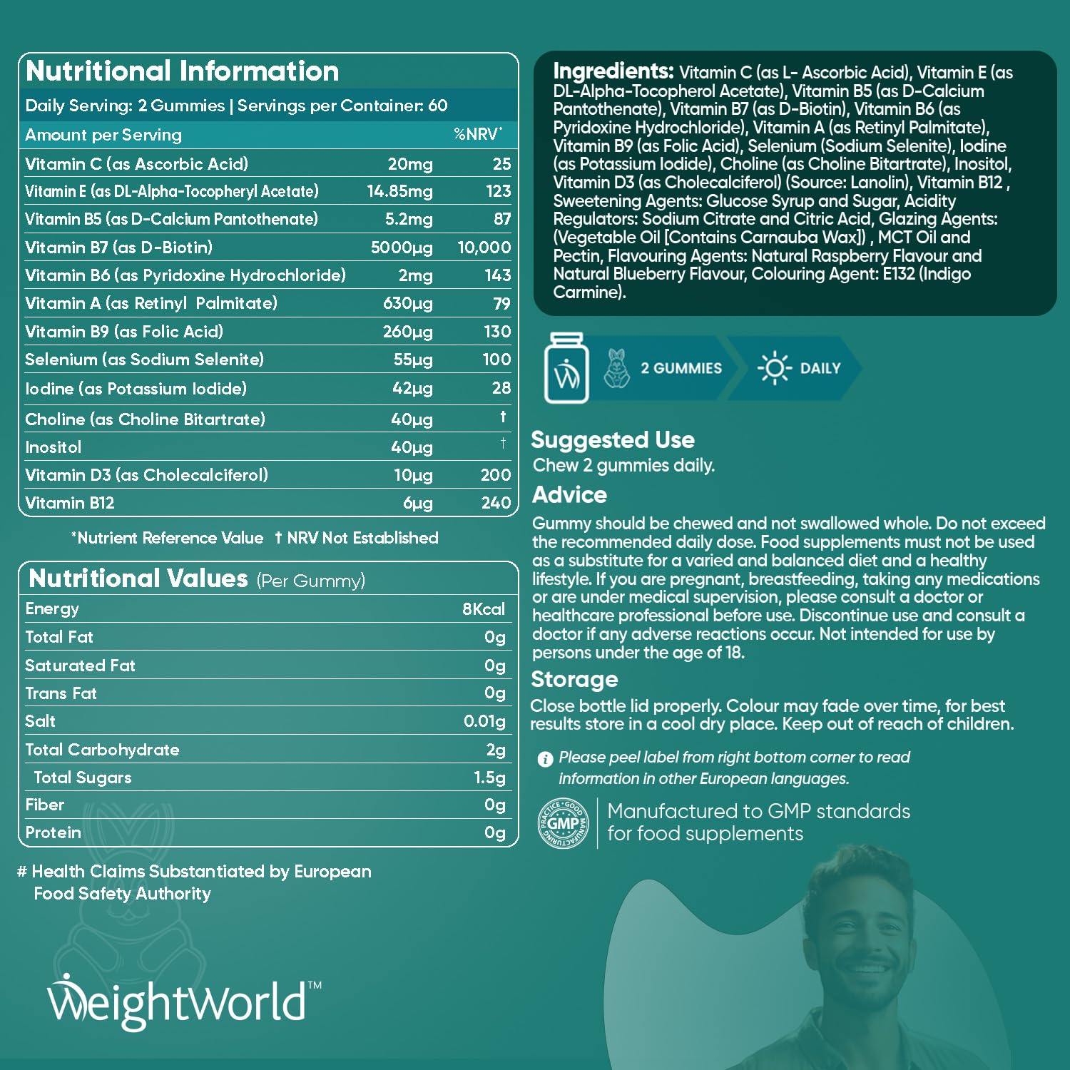 Why WeightWorld Biotin Gummies? - Are you searching for hair vitamins or nail vitamins for women and men to make you feel and look your best? Go no further, as our Biotin skin nail hair vitamins are here to help. Biotin, also known as Vitamin B7, is crucial for skin and hair. Biotin contributes to the maintenance of normal hair and skin. So, why take separate hair, nail, or skin gummies when you can reap all the benefits from our delicious & chewable hair vitamins & biotin hair gummies? Each serving of our biotin gummies & high strength biotin gummies for hair gives a potency of 5000mcg of Biotin (Vitamin B7) for your daily health. Each bottle contains 120 delicious biotin-chewable vitamin gummies (not Biotin tablets or Biotin capsules) to keep you restored for two months. Biotin Gummy Supplement is good for your overall beauty. Apart from that, Biotin also contributes to normal energy-yielding metabolism and the functioning of the nervous system (EFSA Approved Claims). So, why take separate hair, nail, or skin gummies when you can reap all the benefits in one delicious biotin chewable gummy?More Info