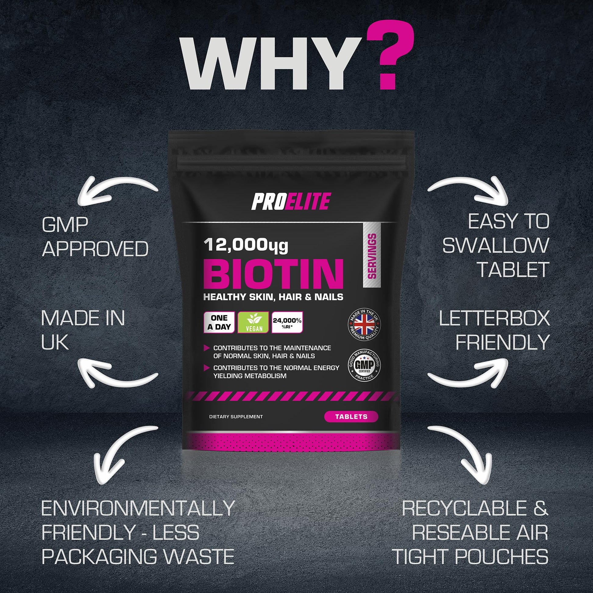 Introducing ProElite's Biotin supplement, a vegan-friendly solution for maintaining healthy skin, hair, and nails. This high-potency formula packs a powerful 12,000mcg of biotin per tablet, contributing to the maintenance of normal skin, hair, and nails. Additionally, biotin plays a role in supporting a normal energy-yielding metabolism. With vegan tablets in each pack, by taking just one tablet daily. Proudly manufactured in the UK under strict quality standards, this supplement adheres to GMP practices, ensuring premium quality. Embrace radiant beauty from the inside out with ProElite's Biotin supplement.More Info