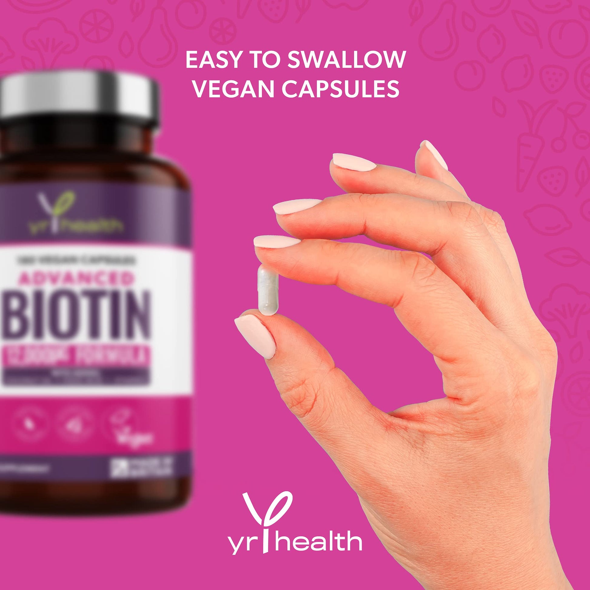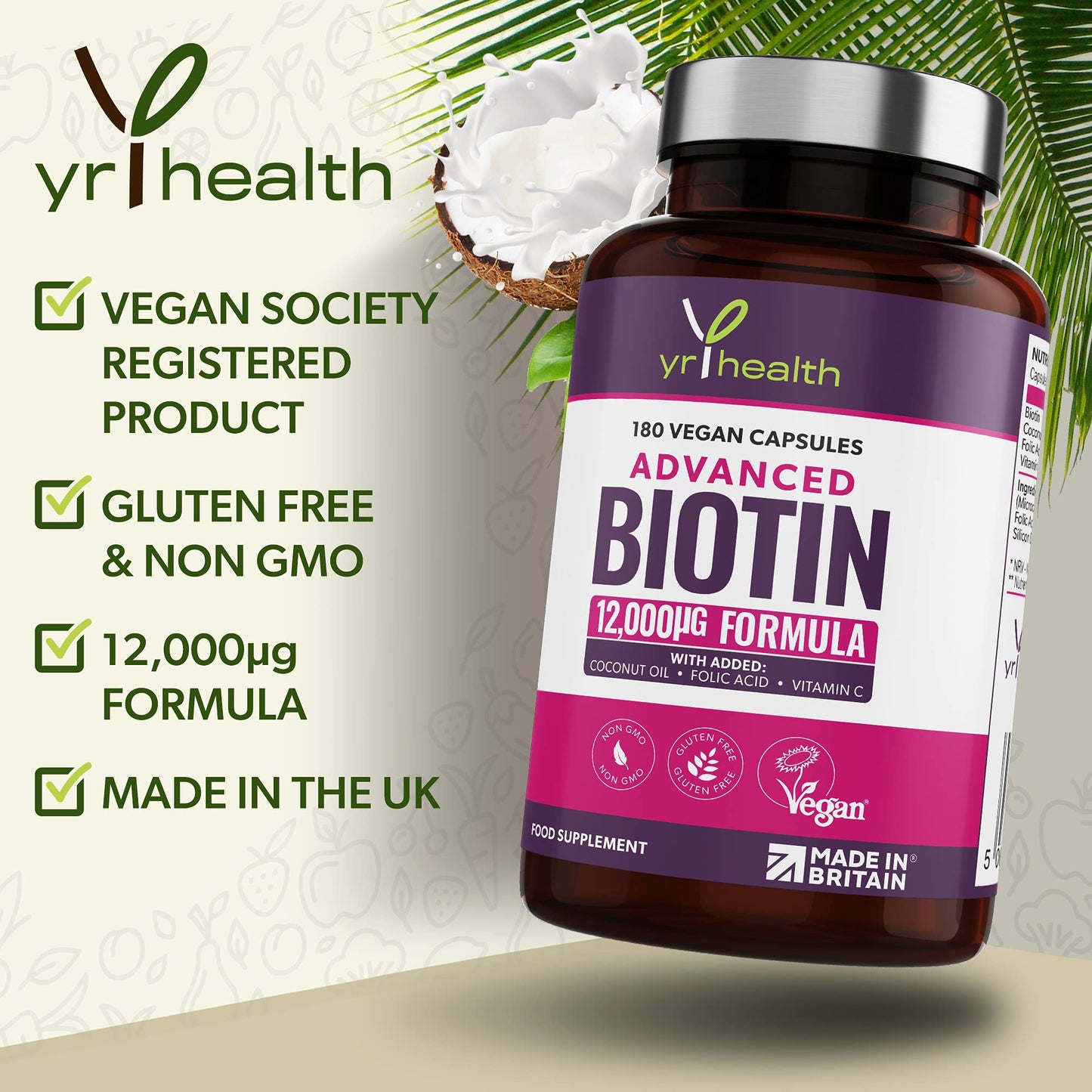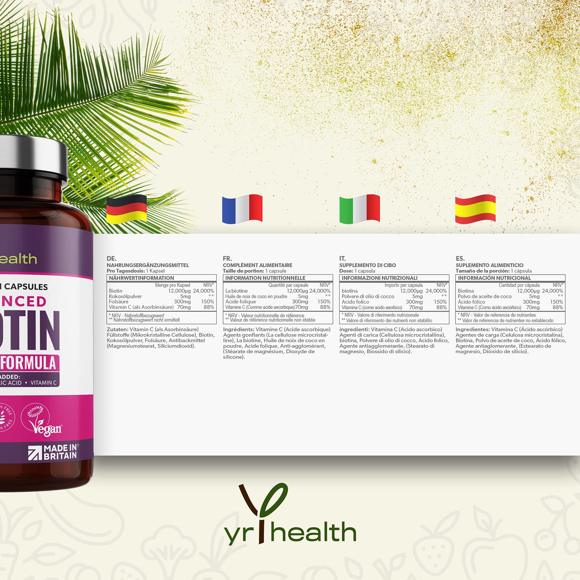 - ✔ WHY YRHEALTH'S BIOTIN? – Our 100% Vegan Advanced Biotin supplement has a massive 12,000mcg of D-Biotin compared to other brands with just 10000mcg. Our experts have blended perfectly with 5mg of Coconut Oil Powder to aid absorption, along with 300mg Folic Acid and 70mg of Vitamin C. These ingredients work in synergy to offer real benefits every time. We have used incredibly easy to swallow, no bad taste capsules rather than tablets often associated with this type of product.