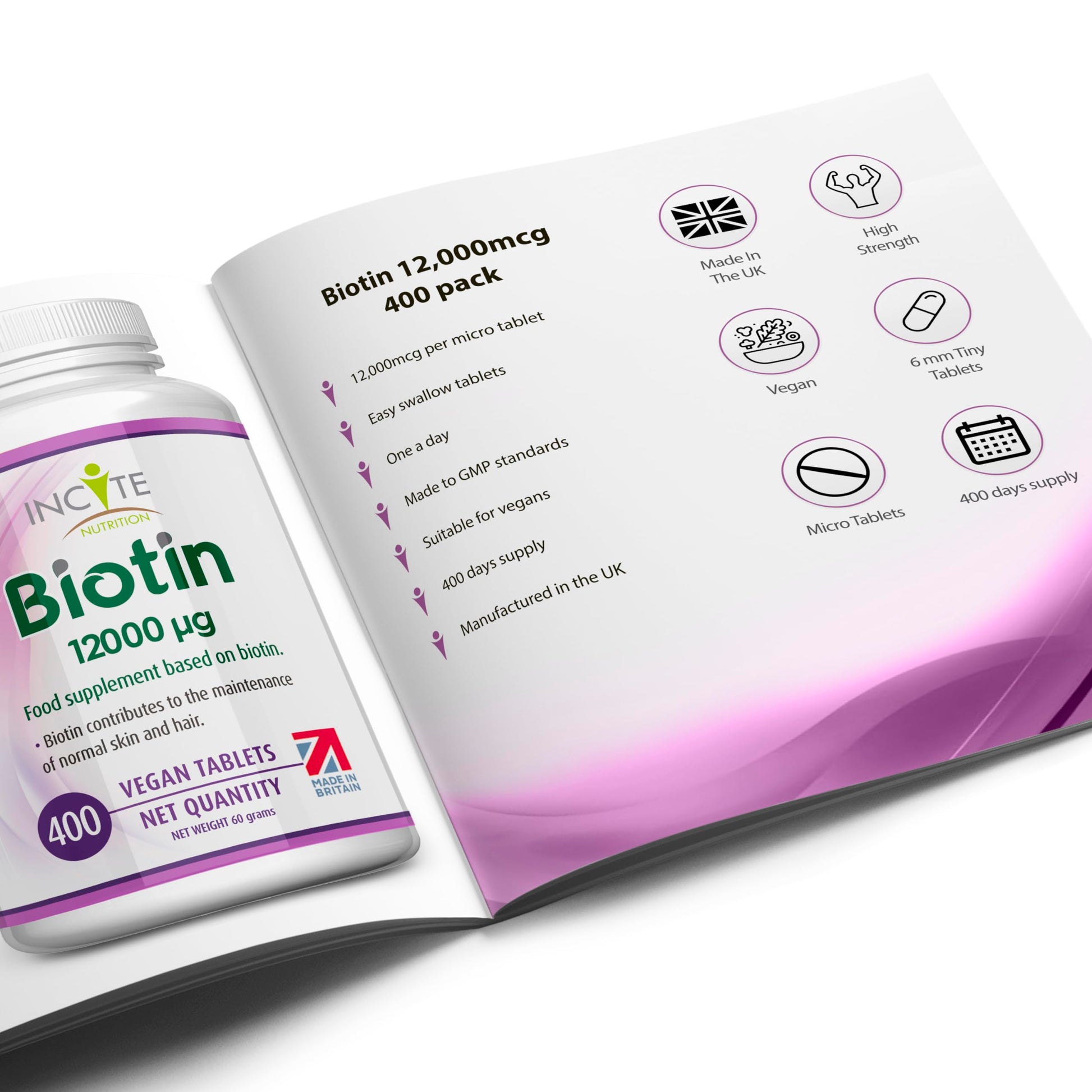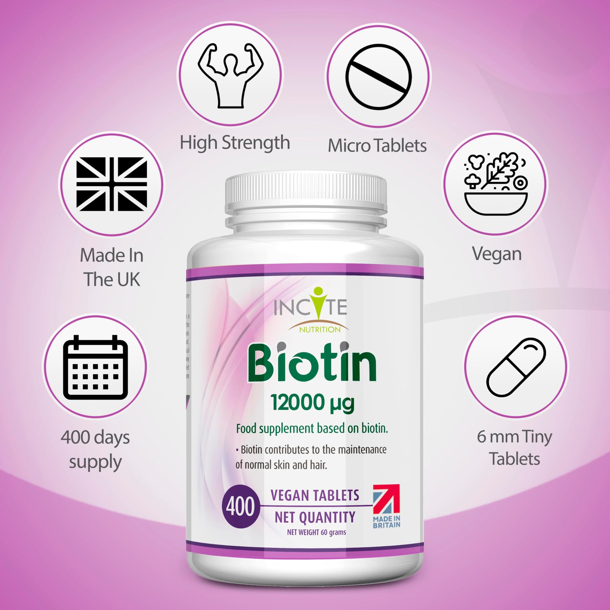 Incite Nutrition's Biotin 12,0000mcg helps maintain healthy hair & skin with a high strength serving of 12,000mcg per tiny 6mm Biotin Tablet. LOW ENVIRONMENTAL IMPACT - Incite Nutrition is a family run business dedicated to helping you achieve your health and wellness goals. SMALL BUT MIGHTY - Don't let the size fool you - Incite Nutrition's Biotin is part of our 6mm tablet range, but it is more potent than a similar products on the market. Our small tablets are also very easy to swallow! OVER 12 MONTH'S SUPPLY - Our incredible 400 tiny 6mm biotin tablets pack gives you incredible value keeping you replenished with Biotin for over a FULL YEAR. No need to reorder every month as Incite Nutritions Biotin Tablets 12,000mcg are 1 per day and 400 tablets per bottle meaning over a year's supply. DOSAGE AND QUANTITY - Our High Strength biotin hair support supplement provides a daily intake of 12,000 mcg of Biotin in one tiny 6mm biotin tablet. We are also one of the best value suppliers and with 400 servings, it will last you over 12 months.More Info