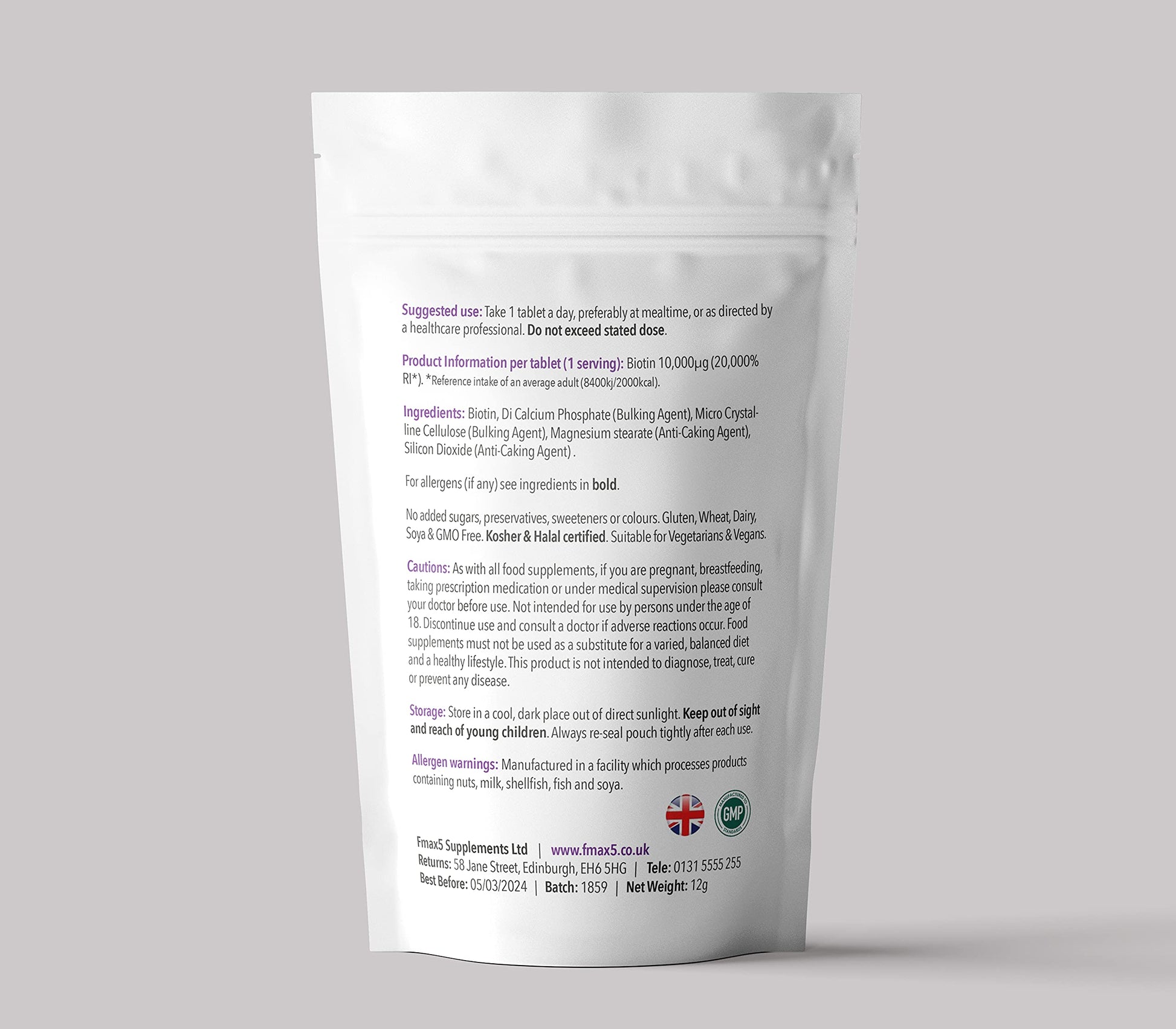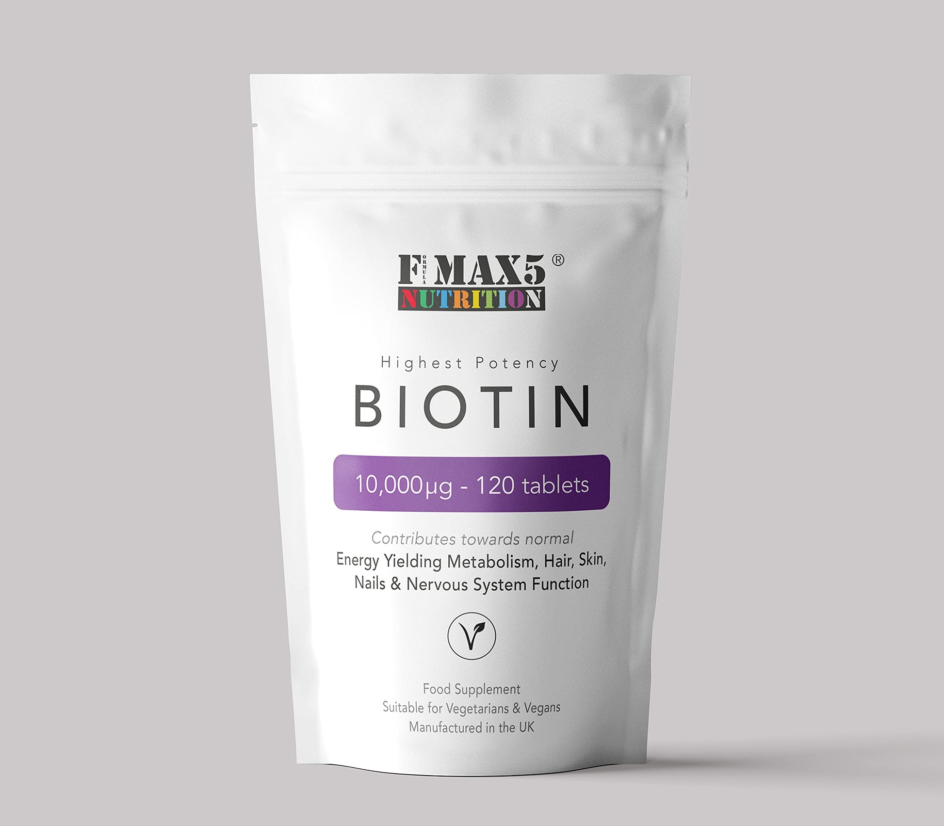 FMax5 Biotin 10,000mcg - Maximum Strength If you're looking for a formula that works to make your nails strong and grow strong glowing hair, FMax5 Biotin is the perfect supplement for you! Key functions & benefits include: Maintenance of normal hair and skin Normal functioning of the nervous system Normal energy-yielding metabolism Normal psychological function Maintenance of normal mucous membranes FMax5 Biotin provides 10,000 mcg to help ensure the daily need for this essential nutrient is met. We also give amazing value, just go compare our prices with other brands. We also offer no questions asked money back guarantee. Why Choose FMax5 Supplements? * ADVANCED FORMULA - Our Biotin is a full 10,000mcg per tablet, twice the strength of many competitors. * EASY TO SWALLOW - Our Biotin tablets are compact and designed to be easy to swallow. * VEGETARIAN FRIENDLY & NASTIES FREE - Suitable for vegetarians & free from artificial colours, flavours, sweeteners, starch, milk, lactose, soya, gluten, wheat, & yeast. * UK PRODUCED - UK produced to the highest manufacturing standards in the world.More Info