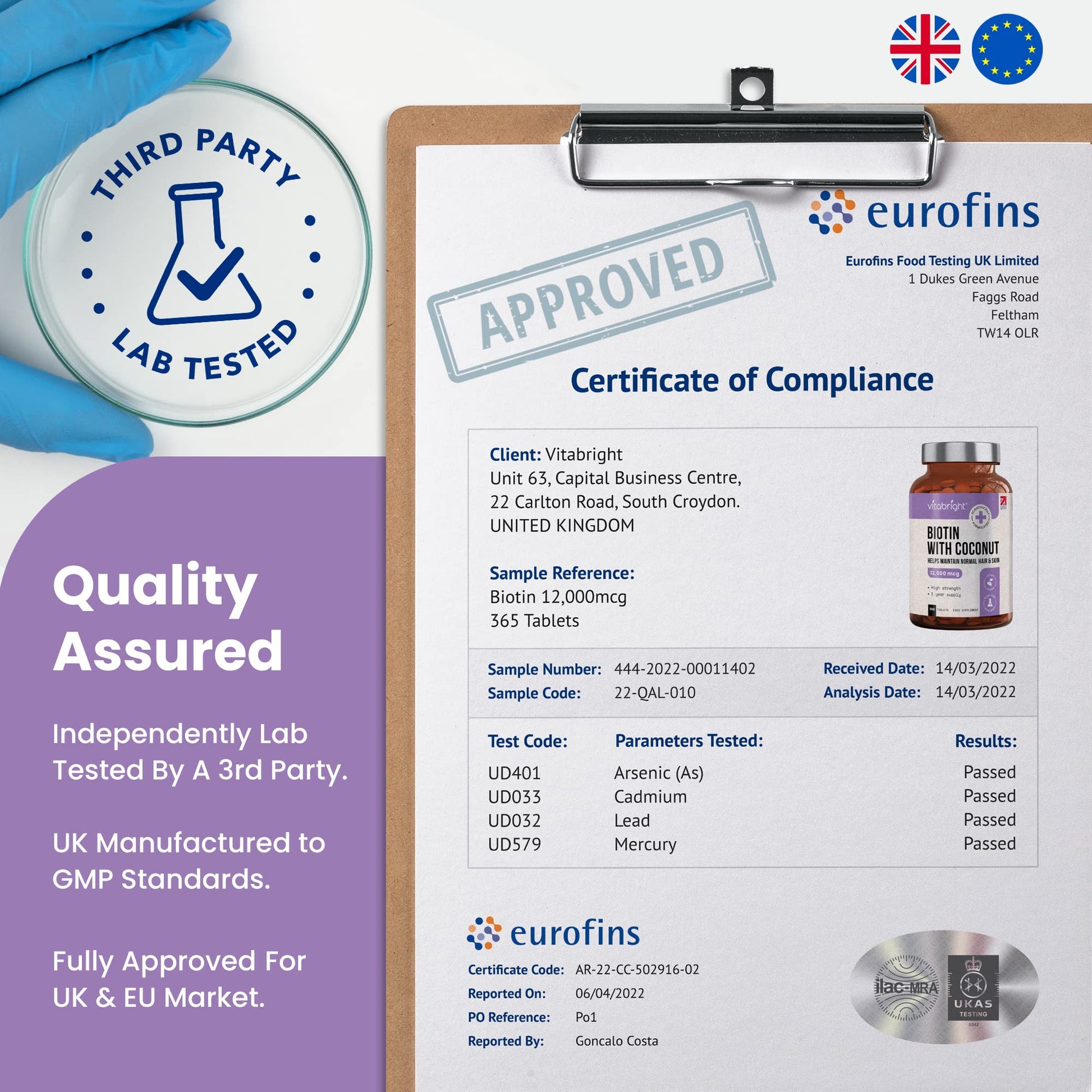 Why Buy VitaBright's Biotin 12,000mcg, Enriched with Coconut Oil☆ MADE IN THE UK - Produced to the highest manufacturing standards in the world in a state of the art facility.