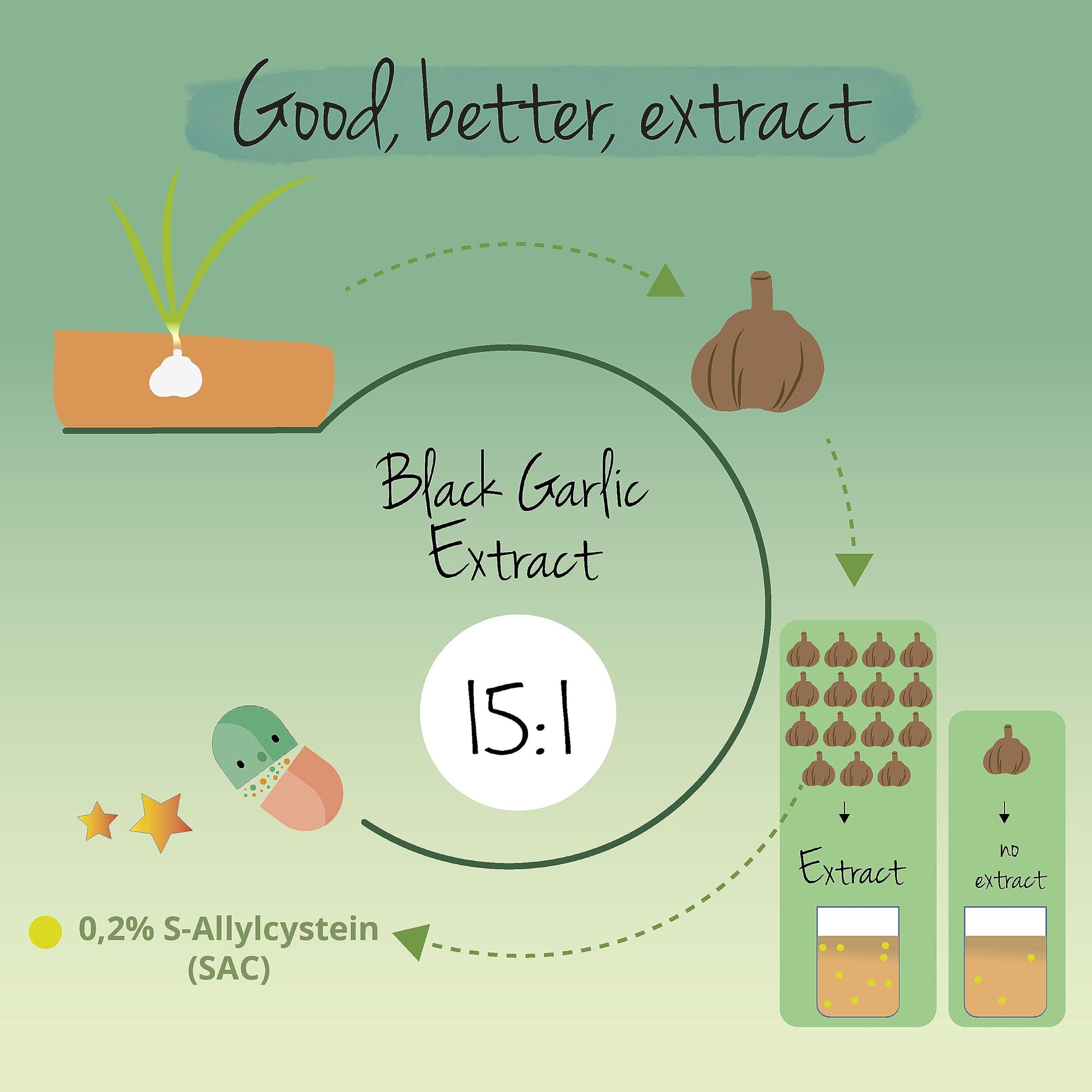 - 🔎 HIGHLY DOSED & ODORLESS: Each capsule contains 750 mg of a high-quality fermented black garlic extract (15:1) which corresponds to 112500 mg of black garlic powder. During the fermentation process the allicin content is reduced, which ultimately eliminates the typical pungent garlic taste. Additionally, our black garlic capsules don’t cause the typical garlic breath and are much easier to digest than conventional white garlic capsules.