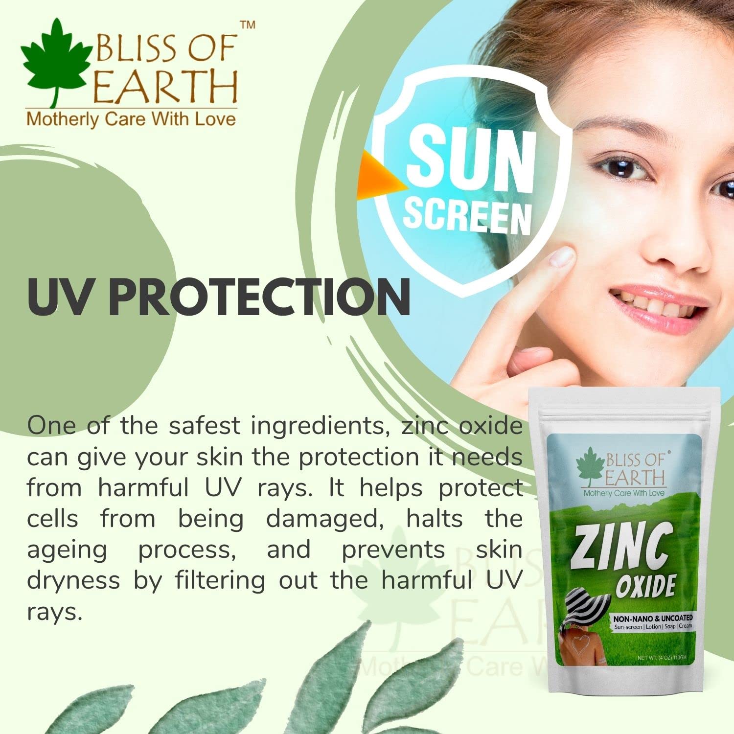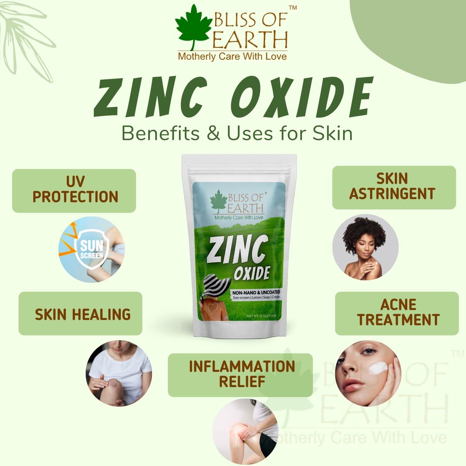 - COSMETIC GRADE: Bliss of earth zinc oxide powder is non nano and uncoated. it the pure grade zinc oxide powder there is no lead or other impurities init."