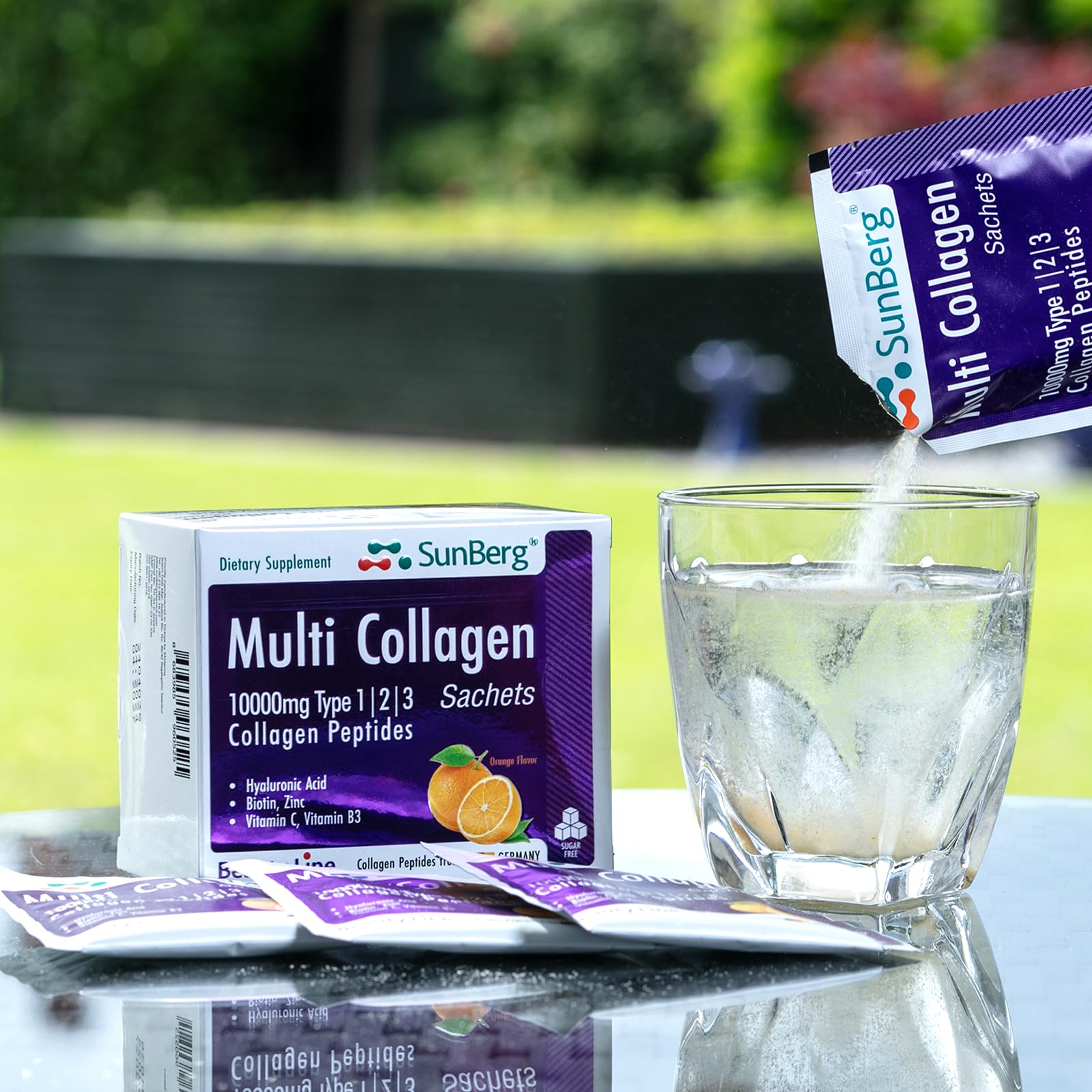 Sunberg multi-collagen 1000mg sachets are formulated to enhance your health and vitality. Each sachet contains a blend of hydrolyzed collagen types 1, 2, and 3, along with essential nutrients like vitamin C, hyaluronic acid, vitamin B3, zinc, and biotin. These ingredients collectively may enhance skin elasticity, hydration, joint flexibility, bone strength, and overall appearance. Hydrolyzed collagen (types 1, 2 & 3) can be essential for skin structure, joint health, and bone strength. Vitamin C in this supplement may support immune system function and boost collagen production, hyaluronic acid may enhance skin hydration, vitamin B3 (niacin) may support skin health and circulation, zinc may support immune function, skin health, and wound healing, and biotin may promote healthy skin, hair, and nails. Sunberg multi-collagen comes in a convenient box containing single-serving sachets, offering a one-month supply. Each sachet is designed for easy mixing with water or yoghurt, making it convenient for daily consumption at home or on the go. Sachets ensures portability and ease of use, allowing you to incorporate collagen supplementation seamlessly into your routine. Sunberg multi-collagen 1000mg sachets are formulated to be a convenient and effective way to support skin, joint, and bone health, as well as overall vitality. Whether at home or on the move, these sachets ensure you can easily incorporate collagen supplementation into your daily routine, promoting a healthier and more vibrant you.