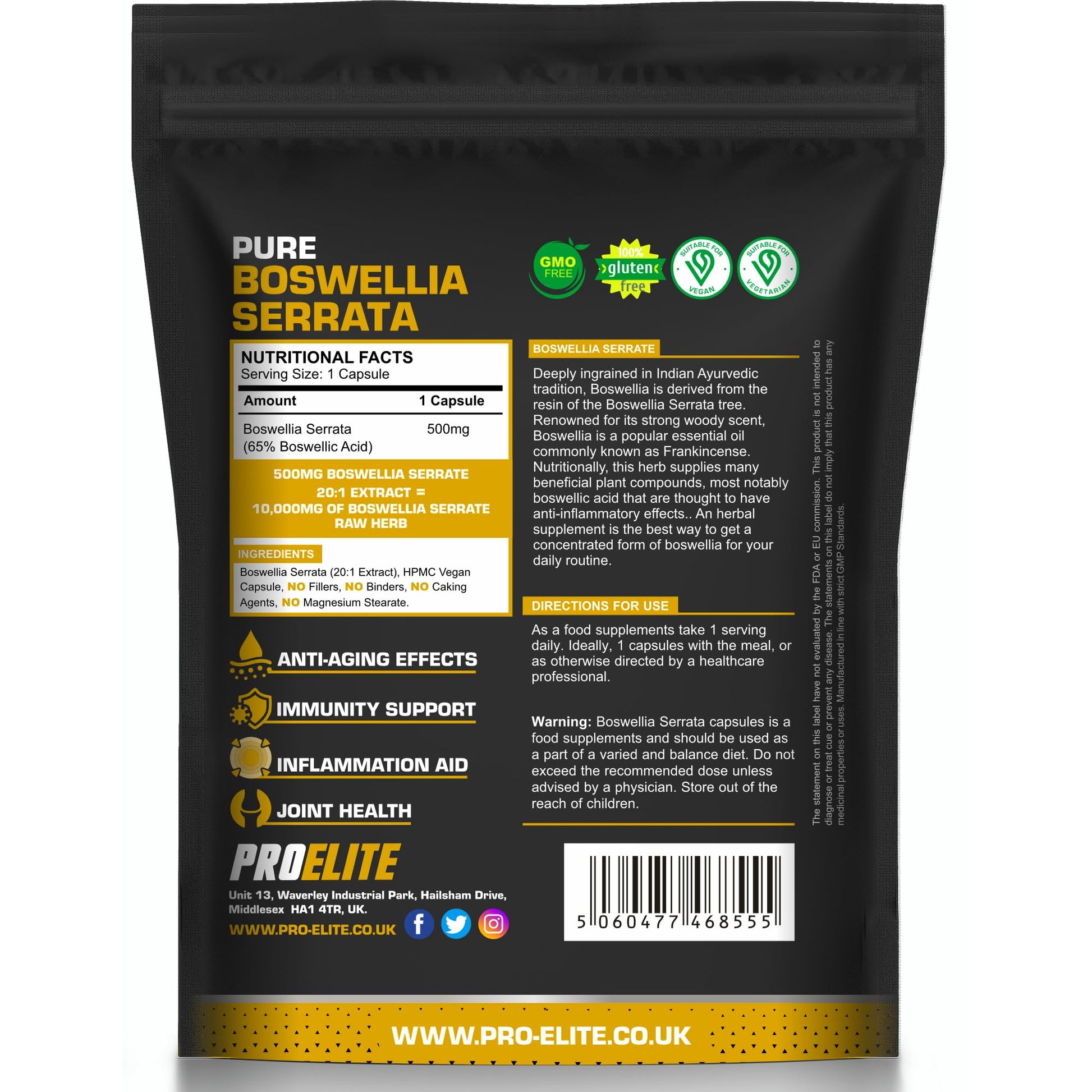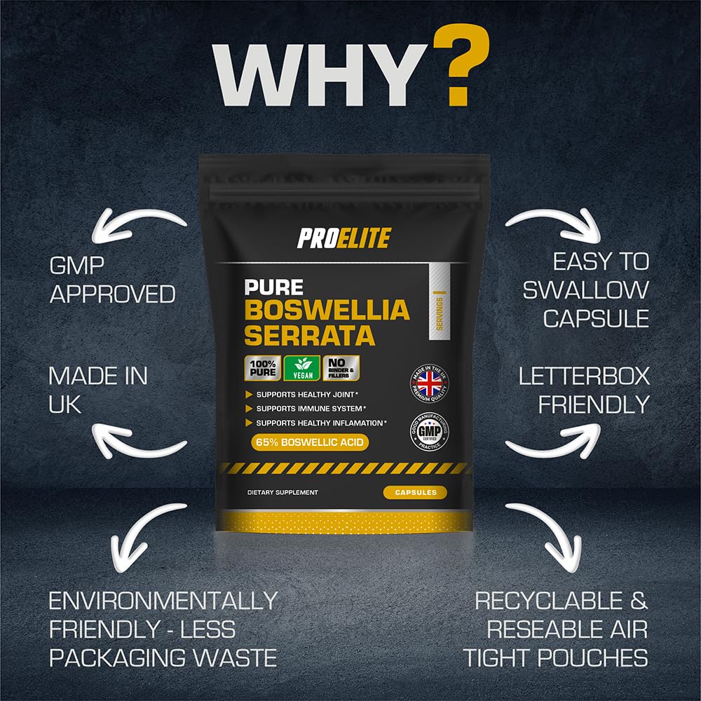 Support your joint health with PROELITE's Boswellia Serrata Extract capsules. Known as Indian frankincense, Boswellia Serrata has been used for centuries in traditional medicine across South Asia, the Middle East, and North Africa. This potent resin is associated with strength, mobility, and stability, helping to keep the body working like a well-oiled machine.Each capsule delivers a high-strength 500mg dose of Boswellia Serrata extract, standardized to 65% Boswellic Acid, a biologically active terpenoid known for its protective properties. This powerful component is said to have a lubricant-like effect, providing daily long-term support for athletes, older adults, and anyone who wants to keep moving with confidence. With a total of 10,000mg per serving and a three-month supply in each pack, you can enjoy the benefits of this powerful supplement daily.
