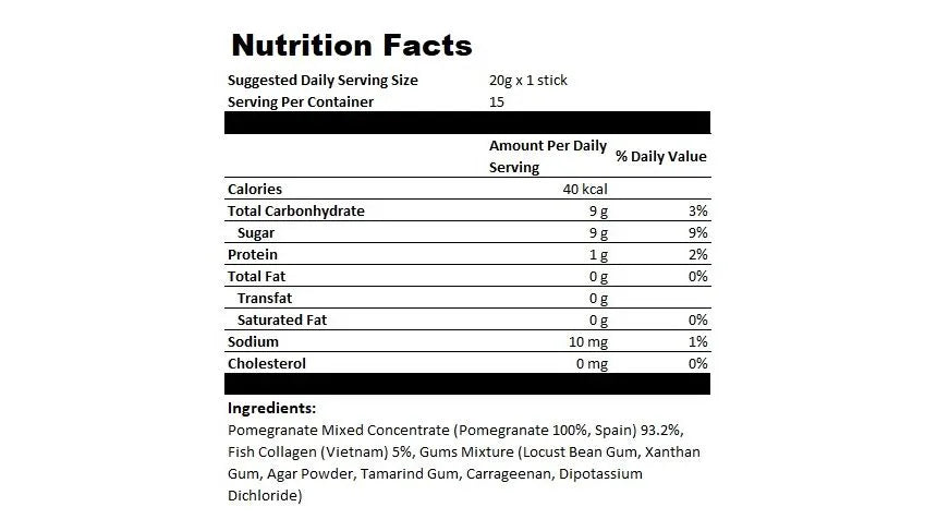 Pomegranate Mixed Concentrate (Pomegranate 100%, Spain) 93.2%, Fish Collagen (Vietnam) 5%, Gums Mixture (Locust Bean Gum, Xanthan Gum, Agar Powder, Tamarind Gum, Carrageenan, Dipotassium Dichloride)