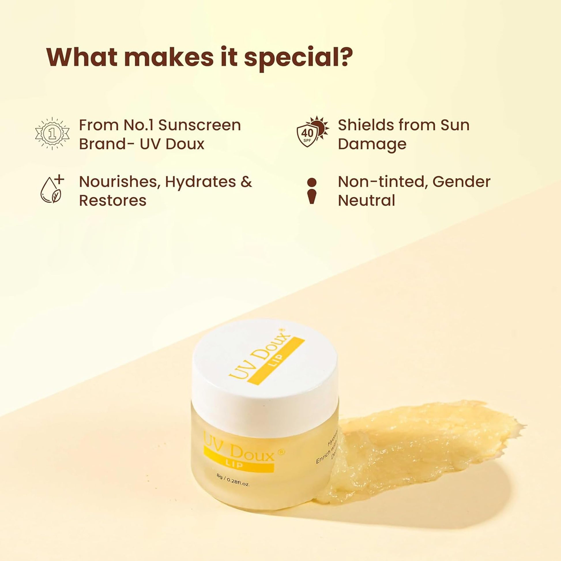 About this item SPF Lip Balm: UV Doux Lip Balm offers SPF 40 PA++ advanced protection against harmful UV rays, keeping your lips safe from sun damage. Exfoliates Dry & Chapped Lips: This lip balm gently exfoliates dry, chapped lips, revealing soft and healthy-looking lips. Enhances Lip Tone: UV Doux unisex lip balm gently evens out lip tone, ensuring supple and healthy-looking lips. Deep Hydration & Nourishment: Enriched with nourishing ingredients like Almond Oil, Olive Oil, and Vitamin E, this lip moisturizer balm deeply hydrates, protects, and nourishes dehydrated, dry lips. Dermatologically Tested Lip Care: UV Doux lip balm with a refreshing vanilla flavour is dermatologically tested for safe, hygienic, and effective lip protection and nourishment.More Info