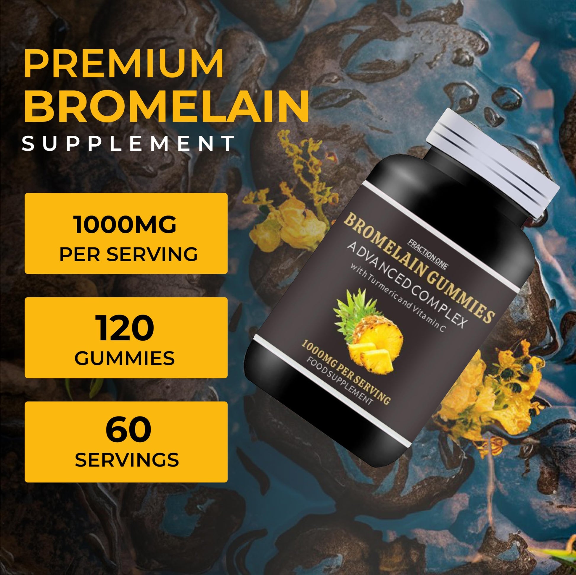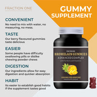 Introducing our High Strength Bromelain Gummies, specially formulated to provide you with the maximum benefits of Bromelain in a delicious and convenient gummy form. Each gummy contains 500mg of potent Bromelain, enhanced with Turmeric and Vitamin C for added anti-inflammatory and immune-boosting properties. With 120 Bromelain gummies per bottle, you can easily incorporate these powerful enzymes into your daily routine to support digestion, reduce bloating, and promote overall gut health. Our Bromelain Gummies are perfect for those looking for an effective and natural way to relieve indigestion, bloating, and discomfort. Whether you suffer from occasional digestive issues or chronic inflammation, our high-strength formula is designed to provide relief and support your body's natural healing processes. Additionally, the inclusion of Turmeric and vitamin C further enhances the anti-inflammatory effects of Bromelain, making these gummies a comprehensive solution for a range of digestive and inflammatory issues. Our mission is to provide you with high quality supplements that are not only effective but also align with your values. Trust in the power of natural ingredients to promote better digestion, reduced bloating, and improved overall well-being. Say goodbye to digestive discomfort and embrace the benefits of Bromelain with our high-strength Bromelain gummies today!More Info
