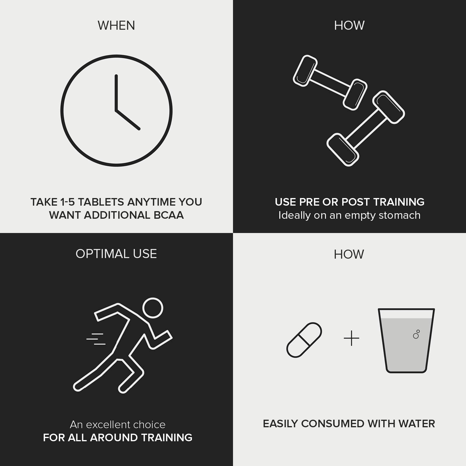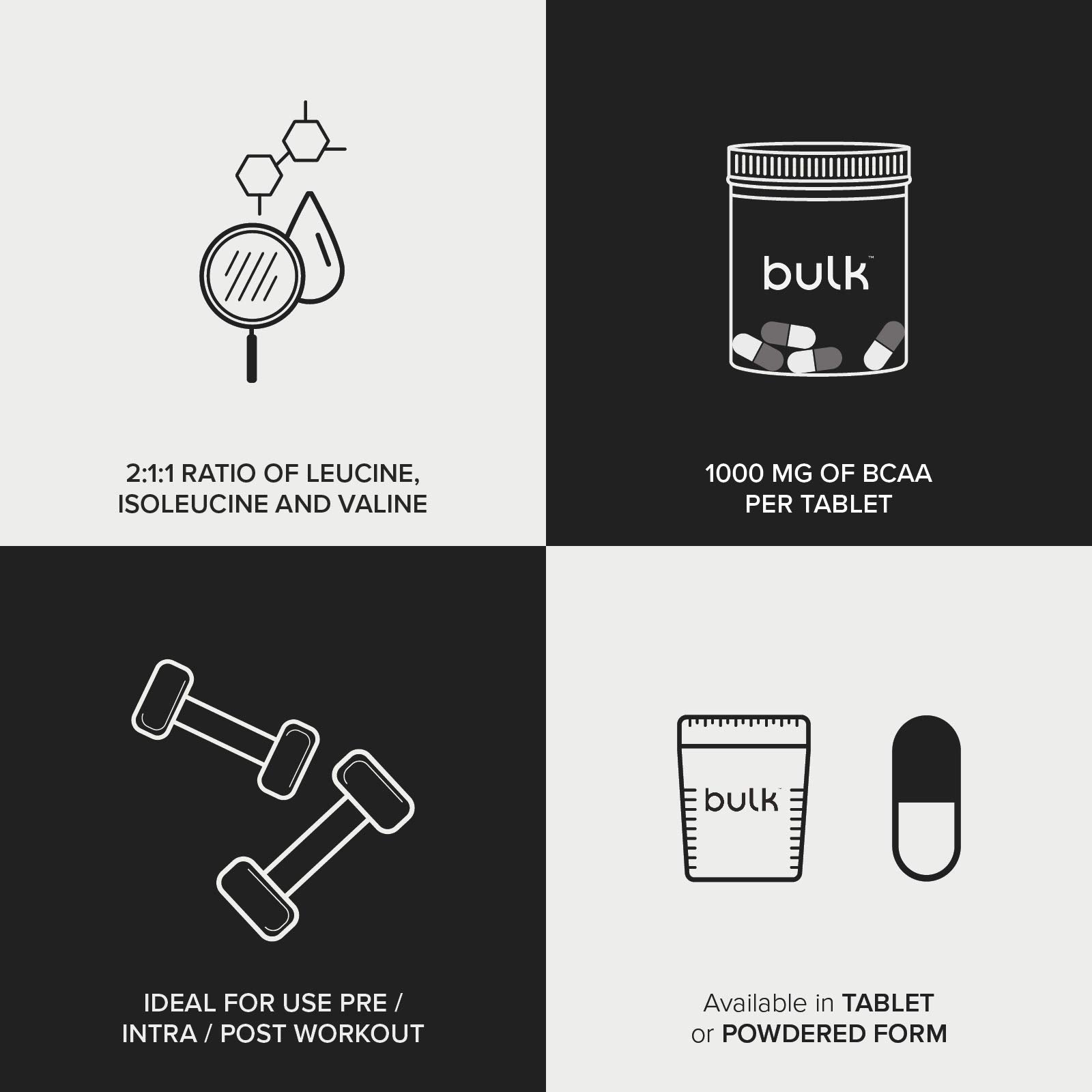 - Highly dosed 1000mg of BCAA per individual tablet