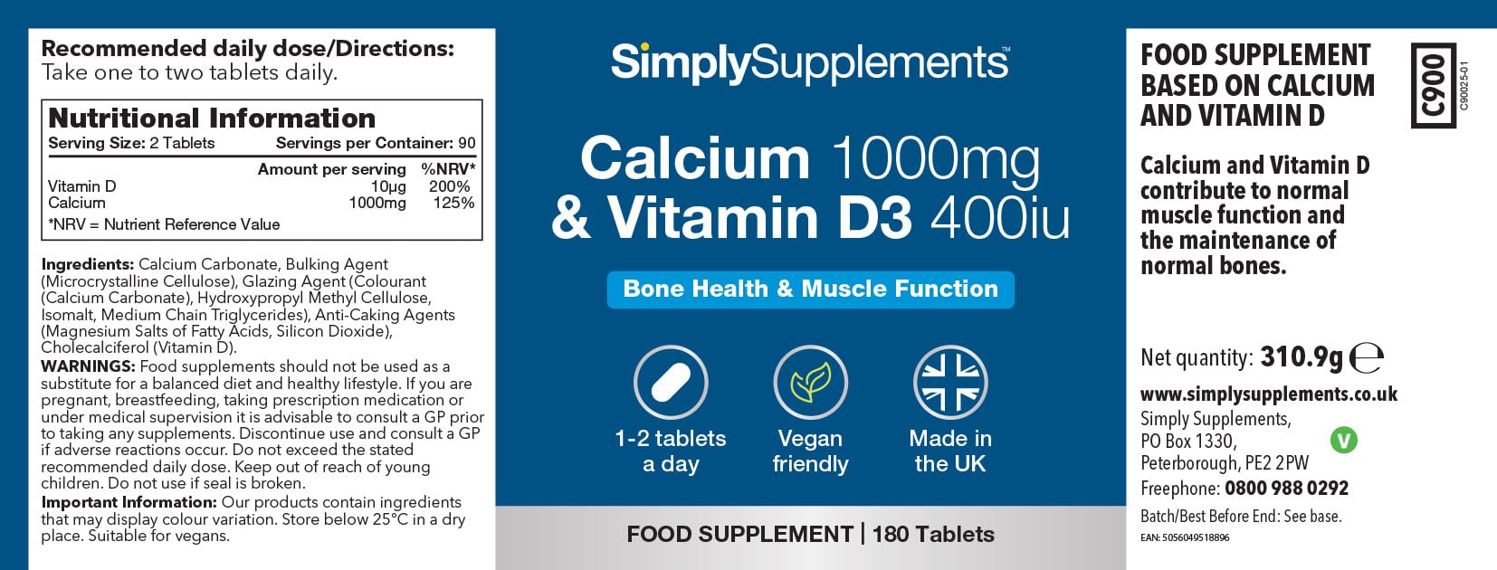Calcium 1000mg & Vitamin D3 400iu | Supports Bone & Teeth Health | Contributes to Normal Muscle Function | Vegan & Vegetarian Friendly | 180 Tablets = 3 Months’ Supply | GMP-Certified & UK-Made