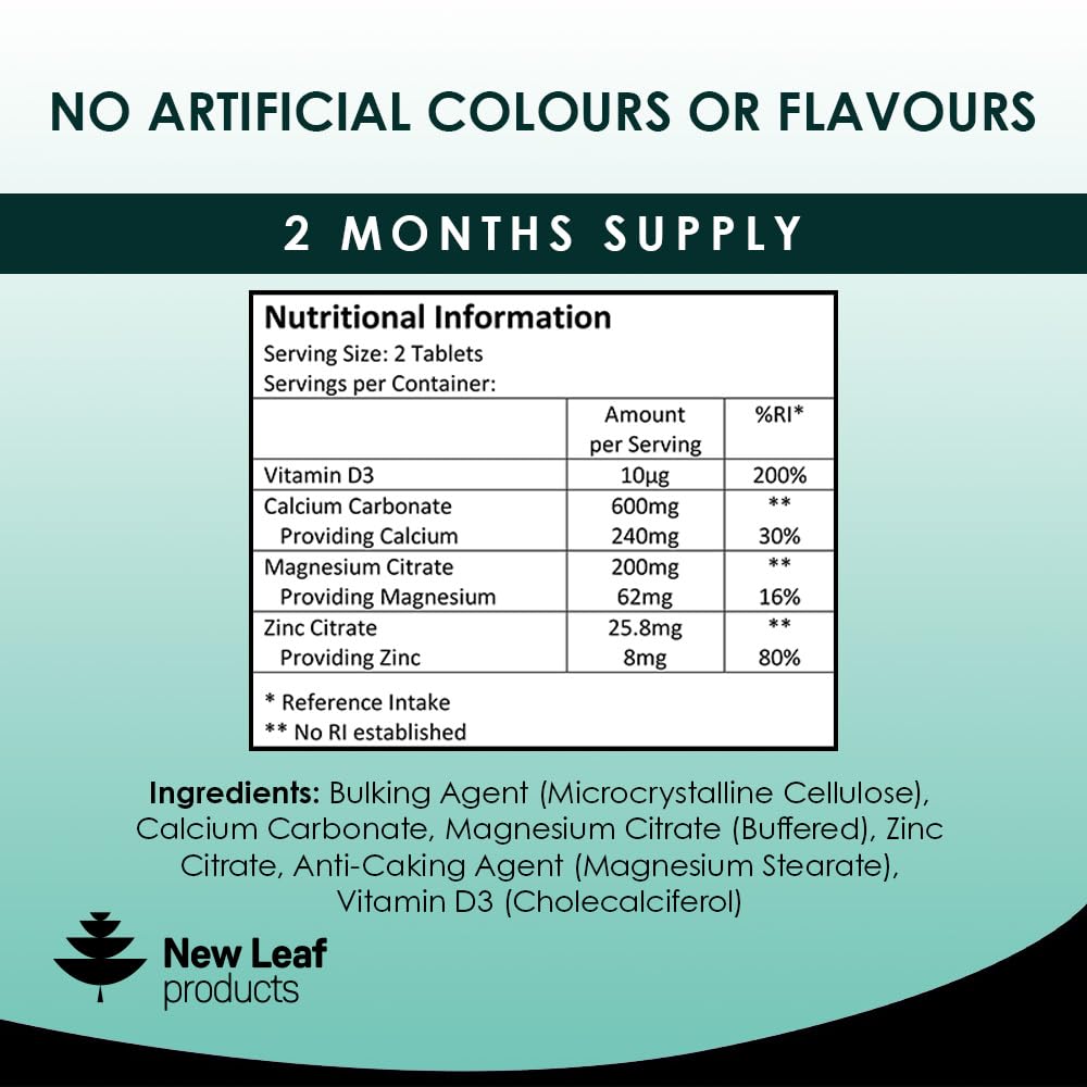 Calcium Magnesium Zinc and Vitamin D - Calcium Supplement - 120 High Strength Calcium Tablets Supplement Calcium Magnesium Vitamin D, Zinc Tablets - Calcium Complex Made in The UK by New Leaf
