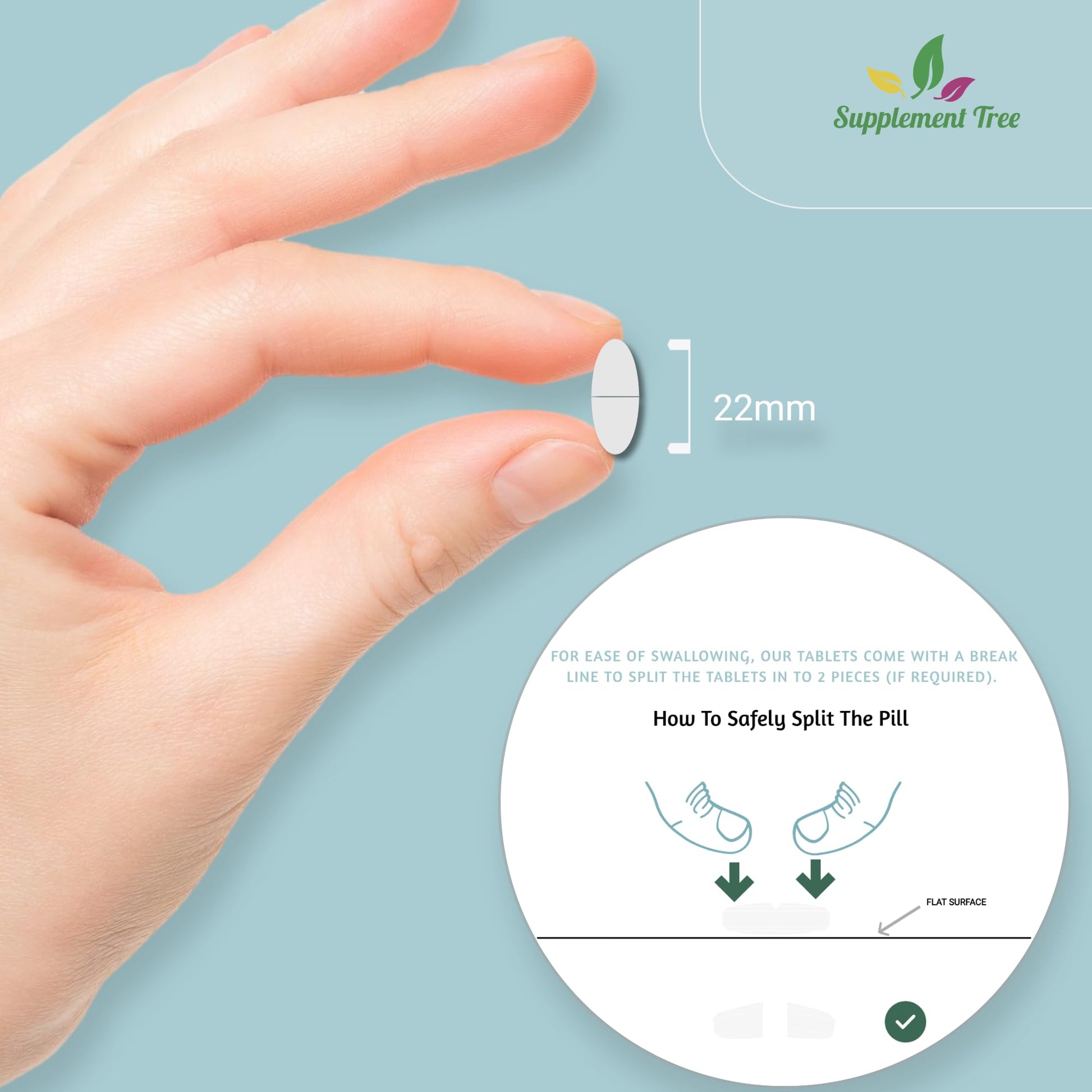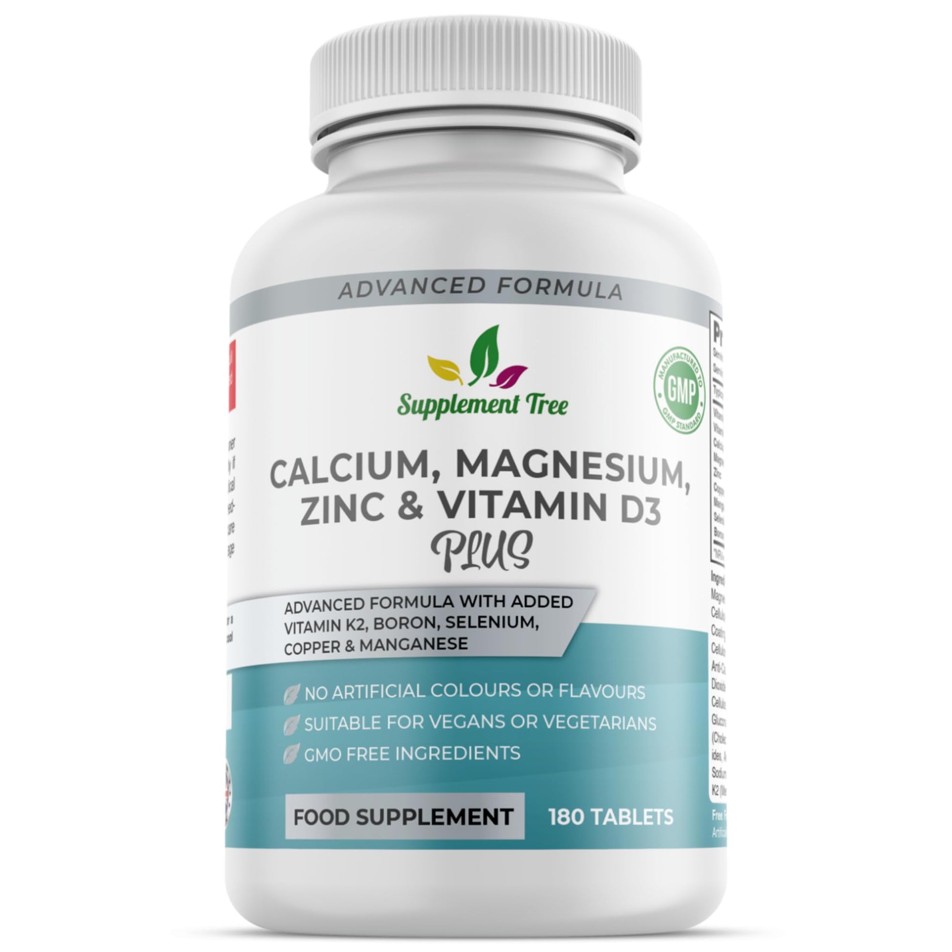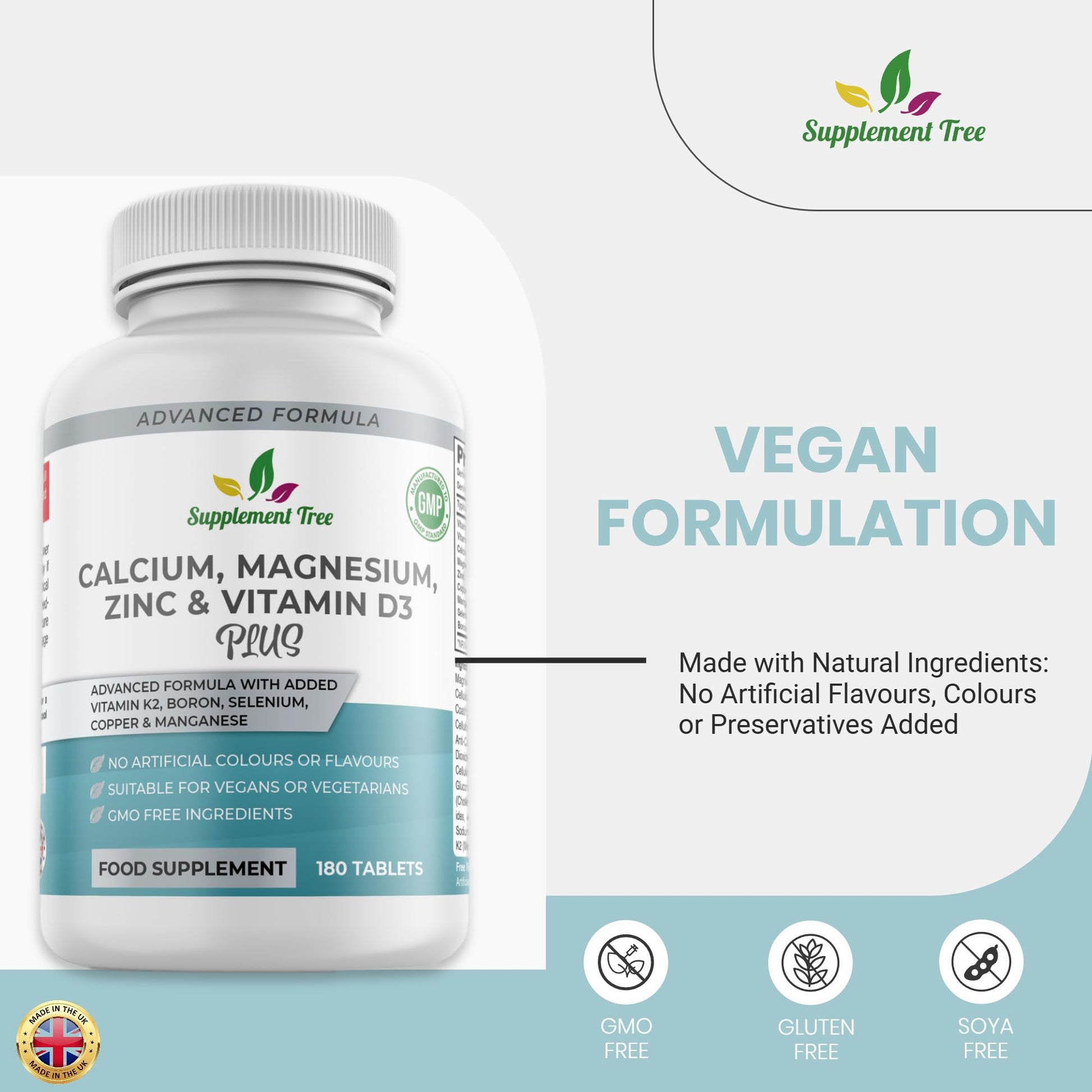 PREMIUM CALCIUM COMPLEX – Supplement Tree’s Calcium, Magnesium, Zinc, Vitamin D Plus is a comprehensive supplement packed with 9 essential nutrients carefully formulated to support bone health, immunity, and overall well-being. Our potent formula combines carefully chosen vitamins and minerals including Calcium, Magnesium, Zinc, Vitamin D3, Vitamin K2 MK-7, Copper, Boron, Selenium & Manganese.9 ESSENTIAL NUTRIENTS – Each daily serving (2 Vegan Tablets) provides Calcium 1000mg, Magnesium 400 mg, Vitamin D3 400IU, Zinc 10mg, Vitamin K2 MK-7 25 μg. Our advanced formula is also packed with Copper, Boron, Selenium & manganese for added benefits. Experience the benefits of our high-strength complex designed to support your overall well-being.