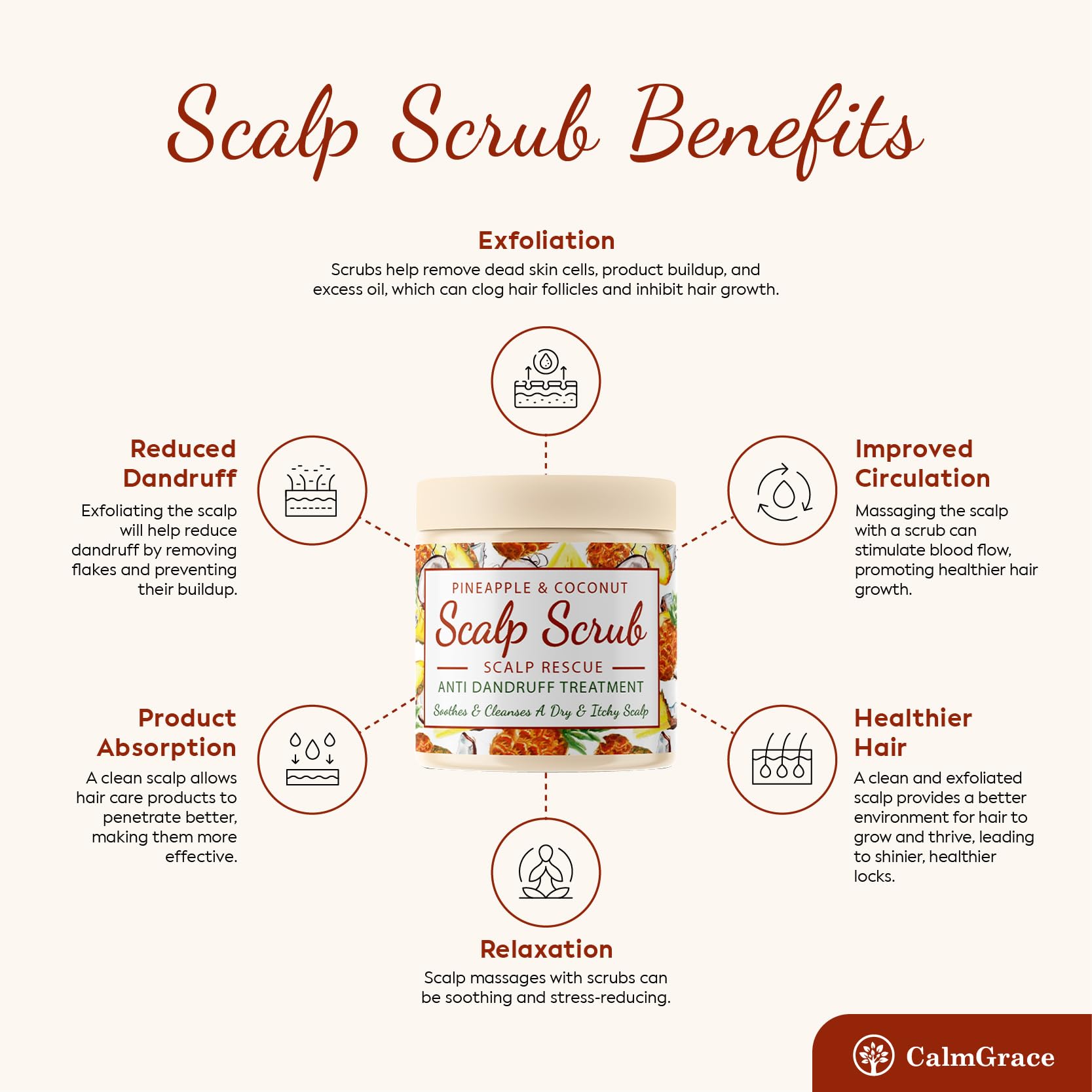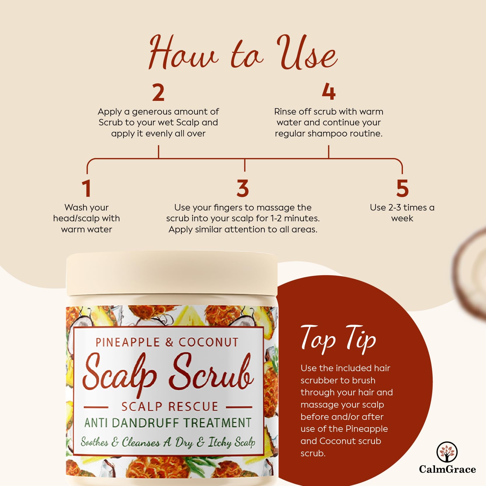 Transform your scalp care routine with the CalmGrace Scalp Scrub with Pineapple and Coconut flavour enriched with Dead Sea Salts. It's time to treat your hair and scalp to the tropical vacation they deserve, all while enjoying the benefits of a revitalized, dandruff-free scalp with our professional scalp scrub for dry hair and experience deep and effective cleansing.Dandruff-Free, Soothed Scalp: