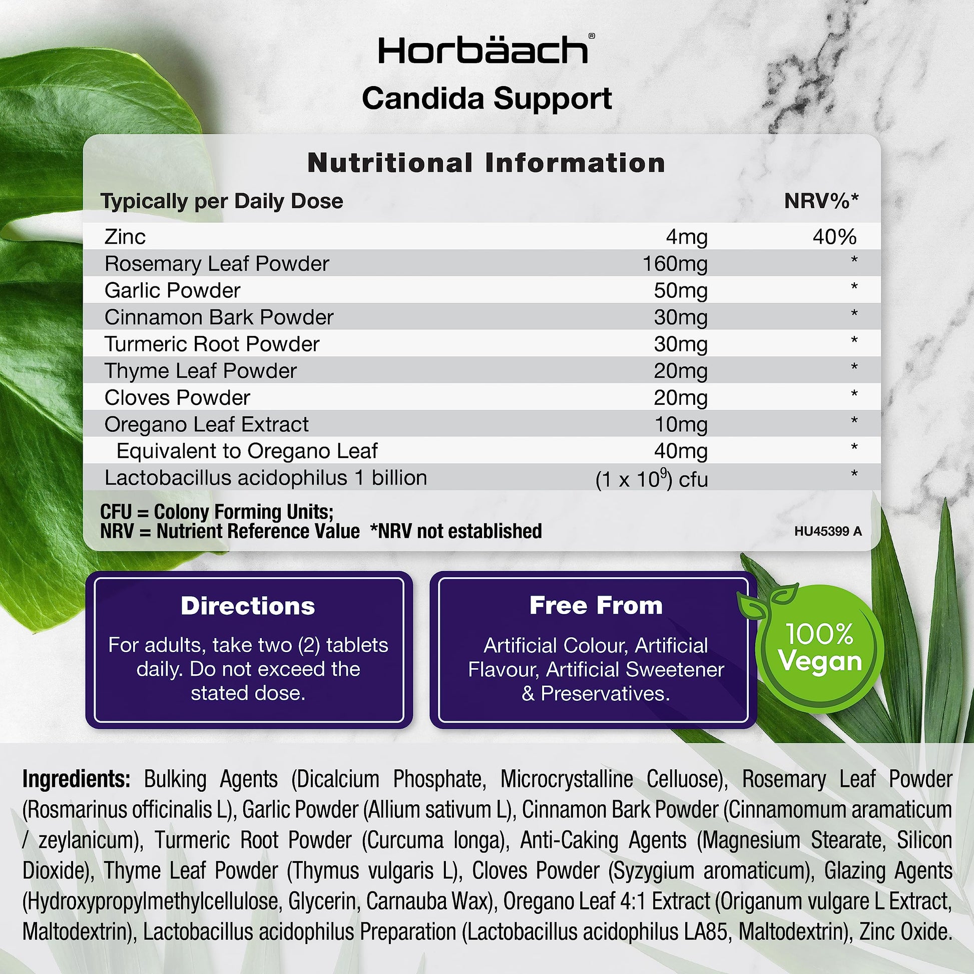 Try our convenient Horbaach Candida Support tablets. This potent formula delivers a complex of natural ingredients including Oregano Leaf Extract, Garlic, Cinnamon, Turmeric, Rosemary and Cloves. In addition, it contains 1 billion CFU of Lactobacillus acidophilus, which is a live bacterial culture found naturally in the gut. Simply take two (2) tablets per day with some water and reap the benefits of this great value supplement for 3+ months!