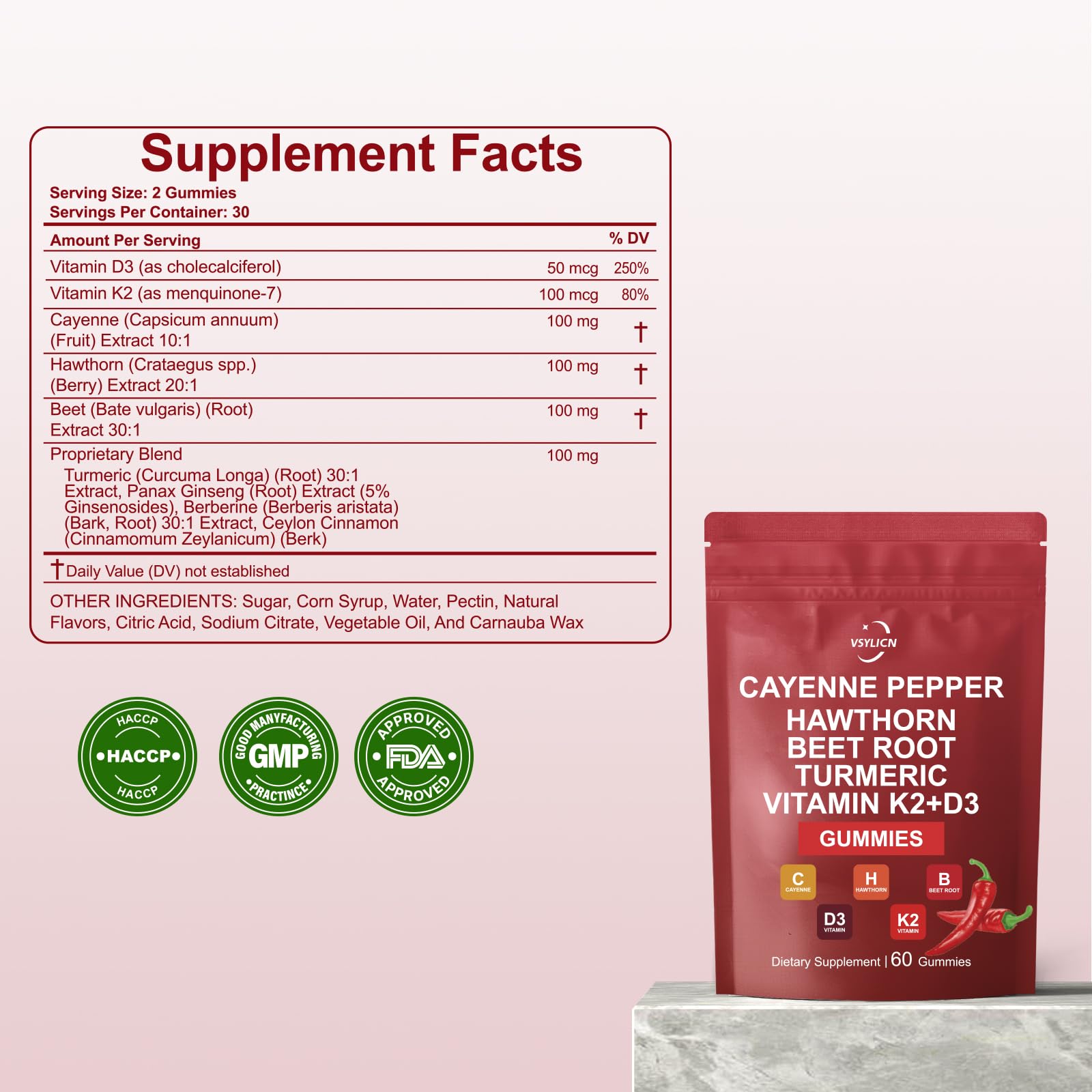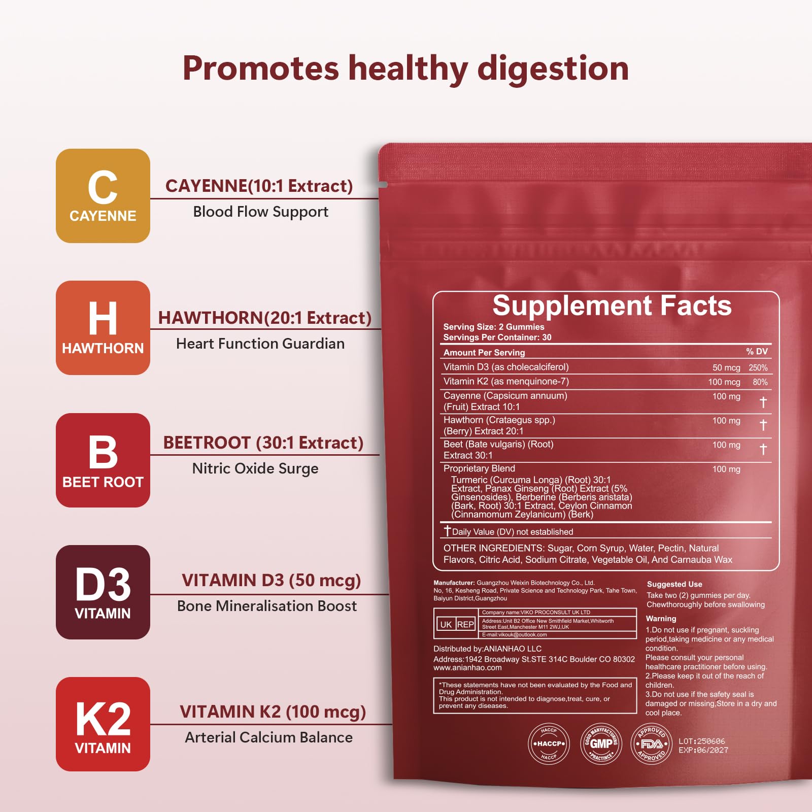 Cayenne Pepper & Beetroot Gummies – Enhanced with Vitamin K2+D3 – Supports Blood Pressure, Vegan, Nitric Oxide Supplement – 60 Gummies – 30 Days Supply