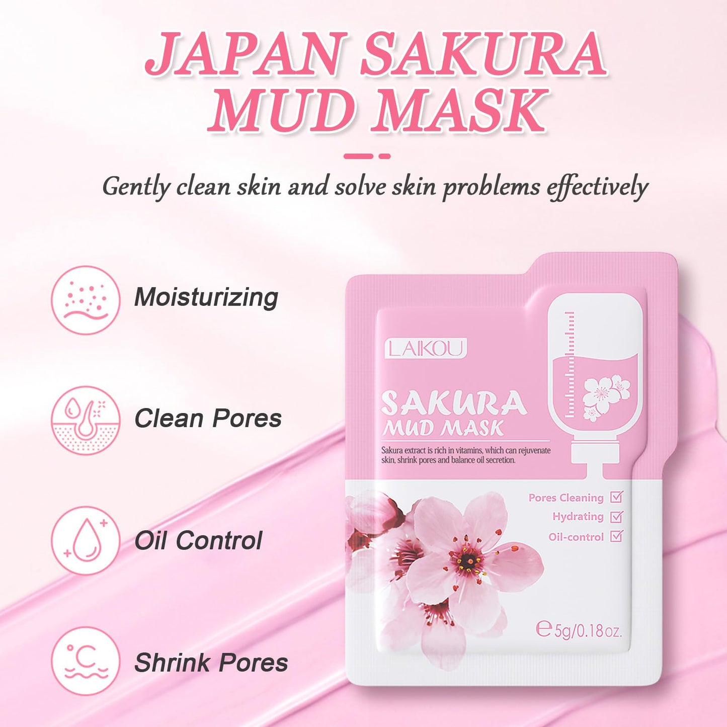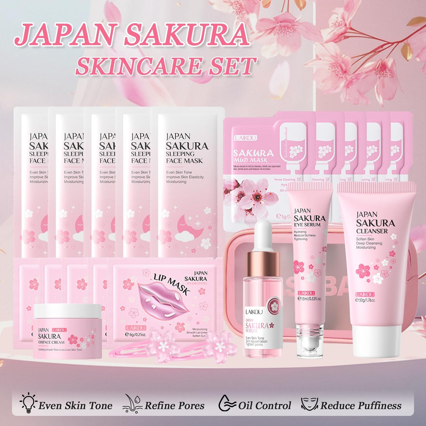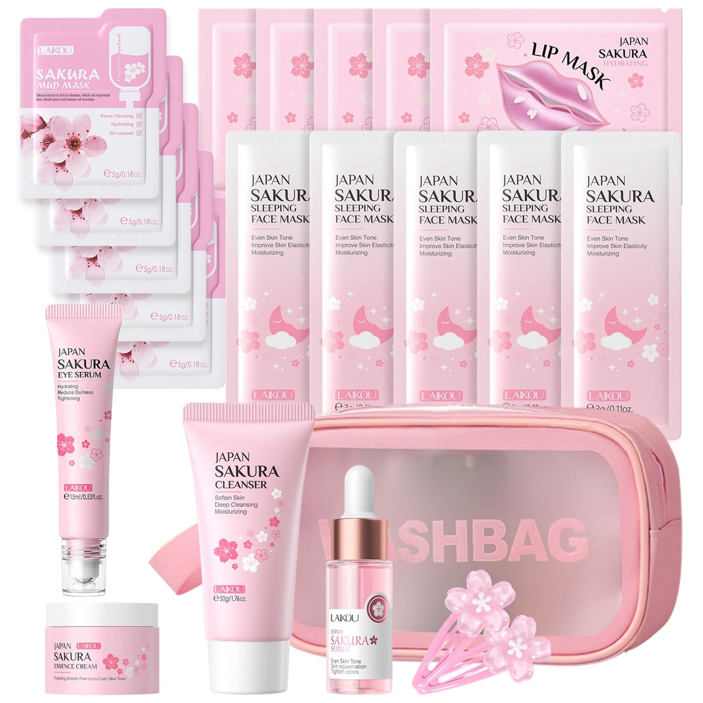 Ceboic Sakura Skin Care Sets & Kits, Cherry Blossom Skincare Set For Teenage Girls Gifts, Facial Kits for Women, JAPAN Skincare Set with Wash Bag, Eye Serum, Cream, Cleanser, Sleep Mask, Mud Mask, Lip Mask