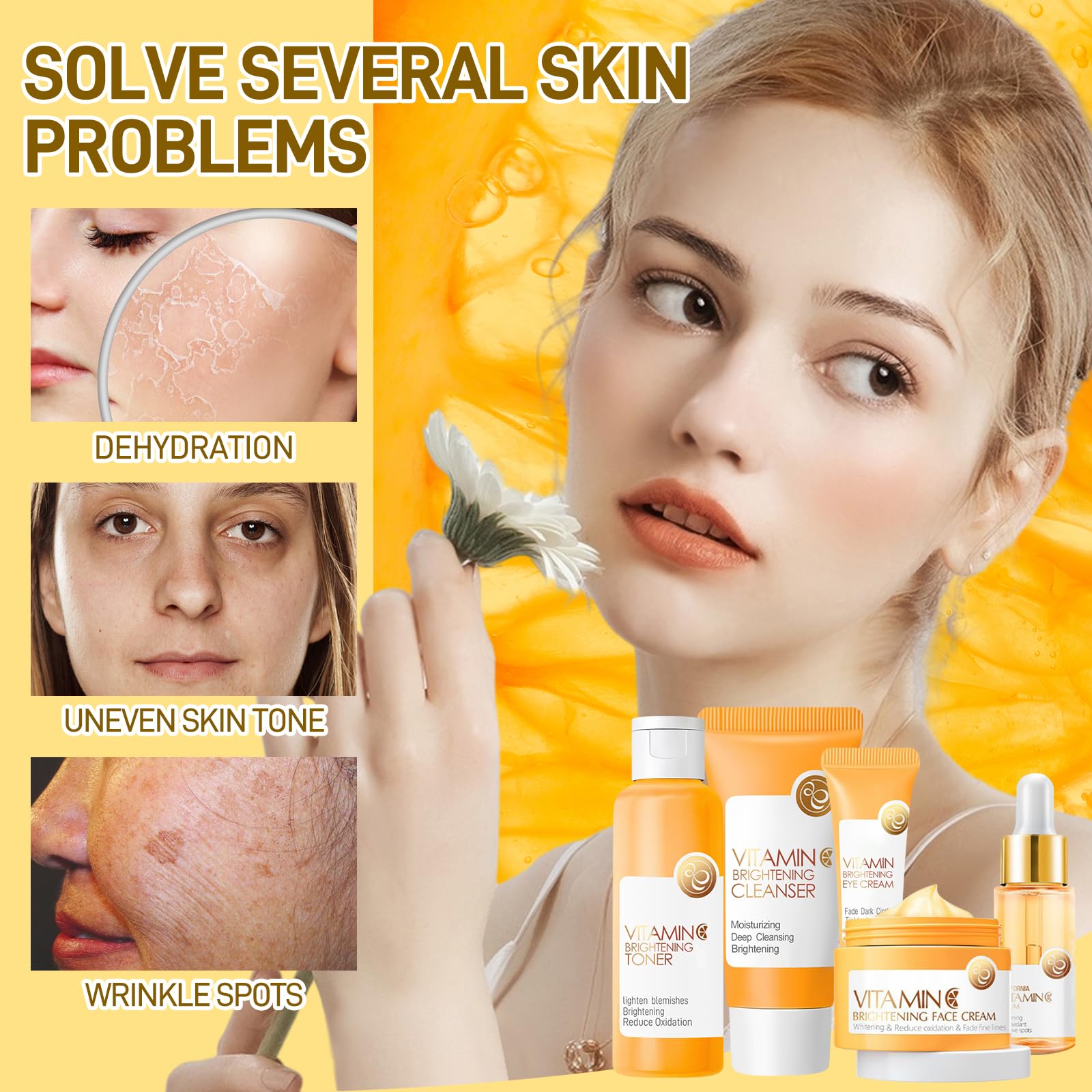 Vitamin C Essence Cream: It is rich in Sakura Extract, which can deeply moisturize the skin, replenish nutrition and enhance the skin. It solves the skin problems like skin dullness, fine lines and skin aging. From inside to outside, it restores skin elasticity and rejuvenates the skin.