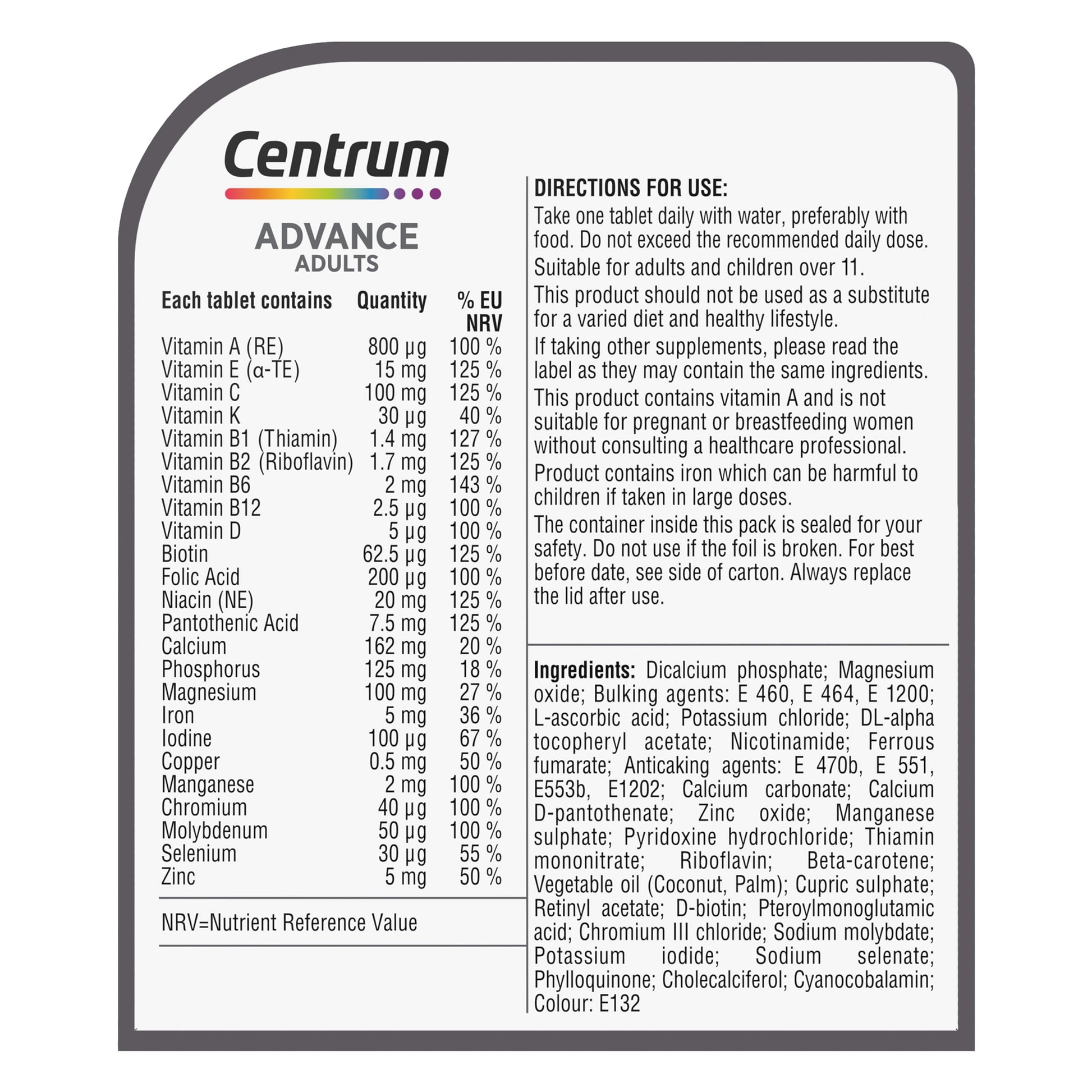 - Centrum Advance contains vitamins B2 and B6 to help unlock energy from food.