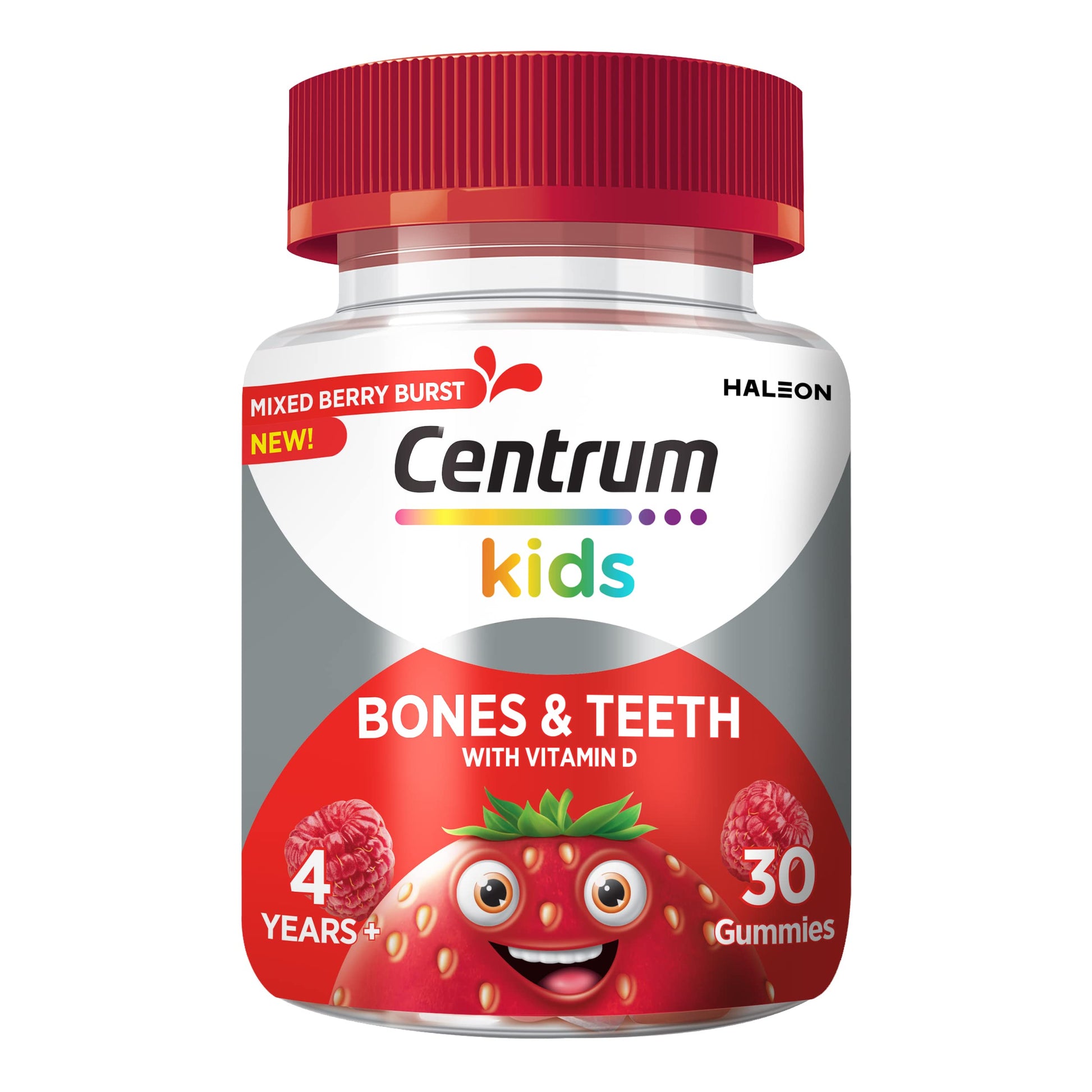 - Centrum Bones & Teeth multivitamins for kids in an easy-to-take, deliciously fruity gummy.