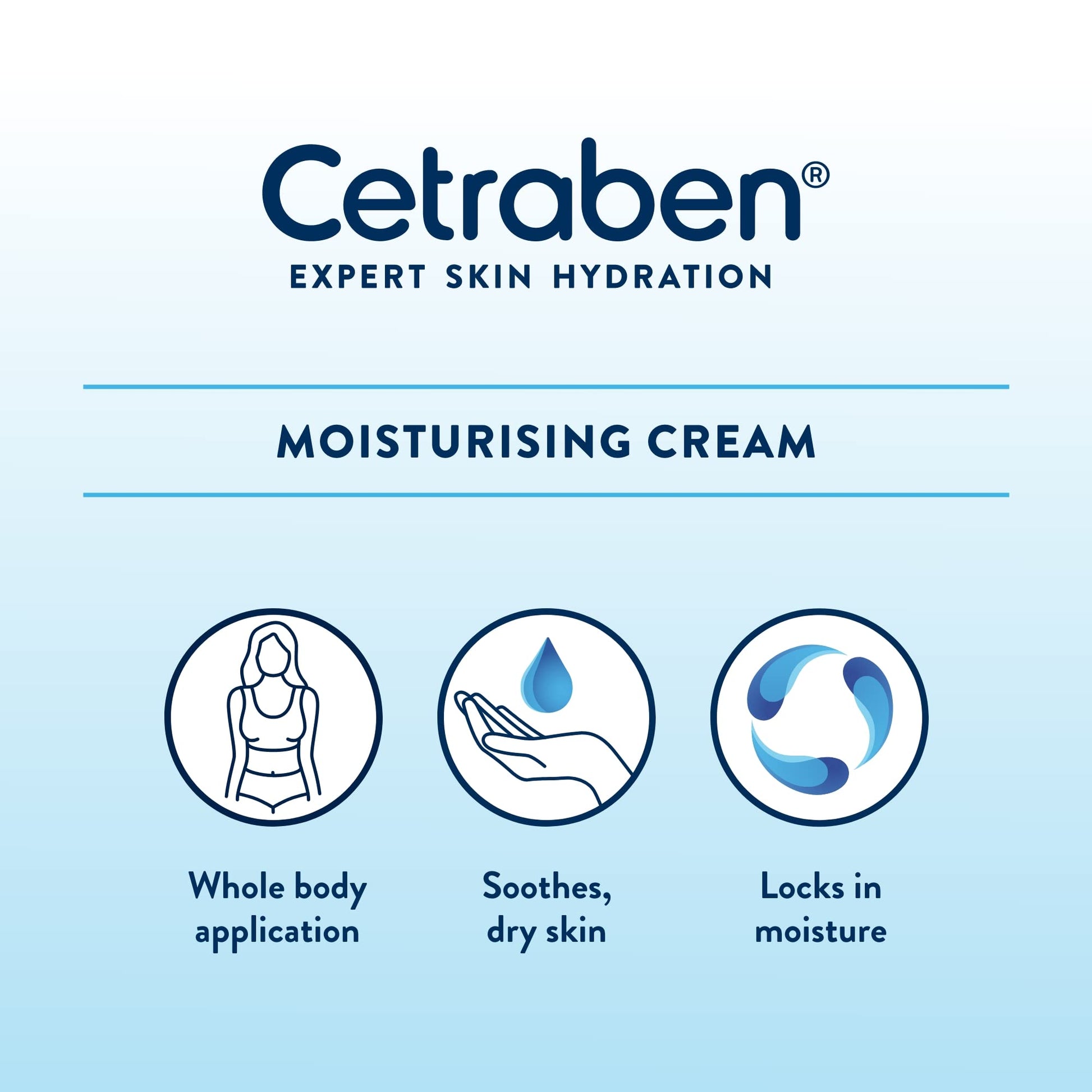 - Directions: The Cream, Lotion and Ointment in the Cetraben range are simple to apply. The Cream and Lotion come packaged with a pump dispenser, helping you avoid mess and waste while ensuring easy and measured applications whenever you need them. Apply to the skin as often as required or directed by your pharmacist of GP, to ensure continued hydration throughout the day. We recommend that you treat your skin as frequently as possible, or as a minimum at least twice a day. Apply liberally to the affected skin, as often as you feel the need to, ensuring that the area is well covered. Apply gently in the direction of hair growth until absorbed. Avoid rubbing the cream vigorously as this could trigger itching, creating more heat in the skin. Apply your emollient before and after you bathe to protect your skin from dryness. In addition, you can use the ointment as a soap substitute as it will be kinder to the skin but just a effective as cleaning it. Prime the pump before first use by depressing fully until cream appears. If the pump stops working do not dismantle. Re-start by covering the nozzle, then fully depress the pump several times to expel air. Use as a daily cleanser: Gently massage Cetraben Daily Cleansing Cream into wet skin and rinse off under warm running water. Pat skin dry with a soft towel. For best results re-apply Cetraben Daily Cleansing Cream as a daily moisturiser. See ‘How to use a daily moisturiser’ for more information. Use as a daily moisturiser: Apply Cetraben Daily Cleansing Cream directly onto the skin. Gently rub in until absorbed. Use as often as required. Ingredients: Purified water, white soft paraffin 13.2% w/w, light liquid paraffin 10.5% w/w, emulsifying wax (SLS free), polysorbate 60, glycerol, cetostearyl alcohol, phenoxyethanol, sodium citrate, citric acid monohydrate. Item display volume: 200.0 milliliters Safety warning: Mild skin reactions, such as redness and rash, have been seen very rarely. Should this occur, use of the product should be stopped. In the unlikely event of side-effects, you should talk to your doctor or pharmacist. Do not use if you are allergic to any of the ingredients listed. Talk to you doctor before use if the skin is badly cracked, infected or bleeding. Avoid contact with the eyes. ! Pregnancy and breastfeeding: Using Cetraben Cream during pregnancy and breastfeeding is unlikely to have any ill effects. If unsure talk to your doctor or pharmacist. Directions for use: For external use only. Adults, the elderly and children: Apply to dry skin areas as often as required and rub in. If you accidentally swallow this product, go to your nearest accident and emergency department. Some important information about the ingredients: This product contains cetostearyl alcohol which may cause local skin reactions. Keep out of sight and reach of children.