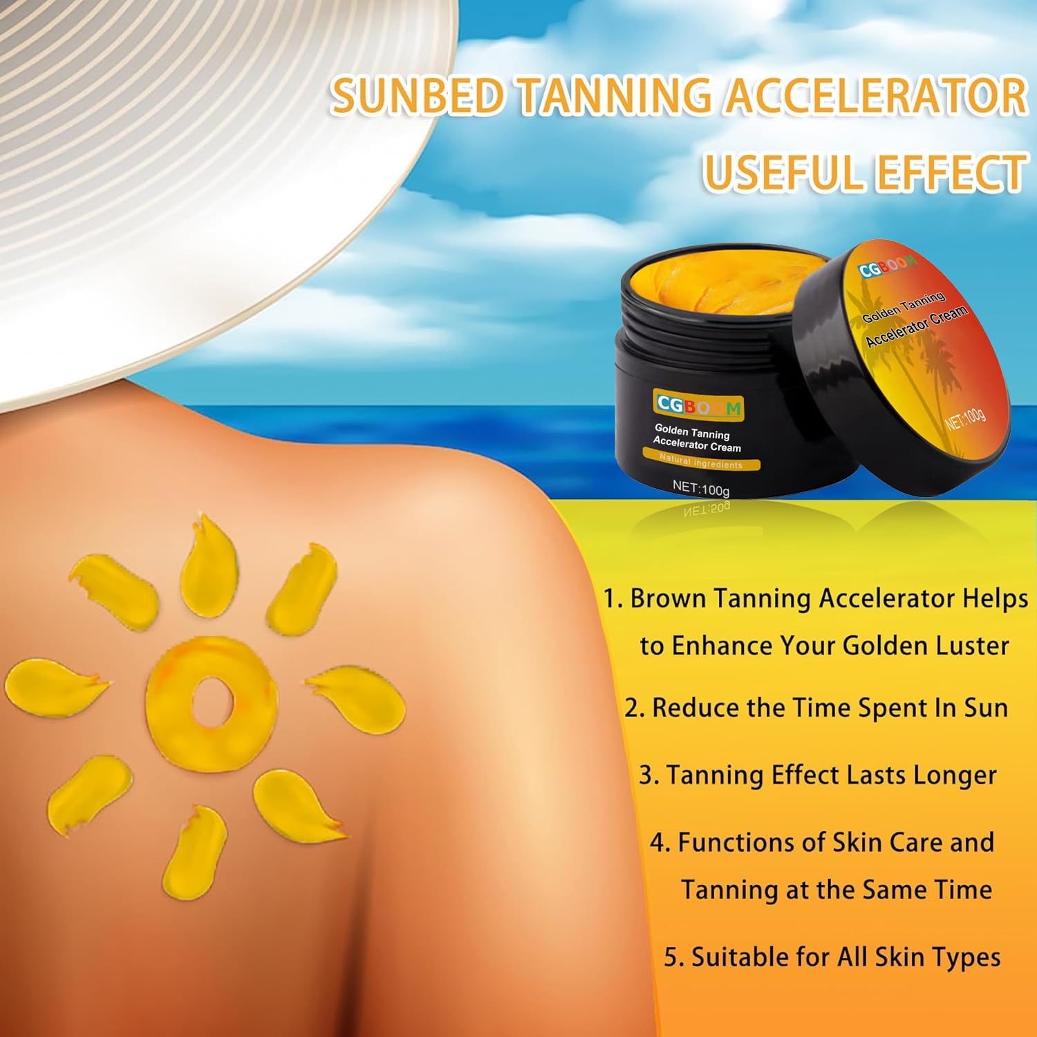 Achieve that coveted sun-kissed glow with CGBOOM Golden Tanning Accelerator Cream.This premium 100g tanning booster features a superior speedy tan formula enriched with natural ingredients including carrot oil, walnut oil, olive oil, and cocoa butter.