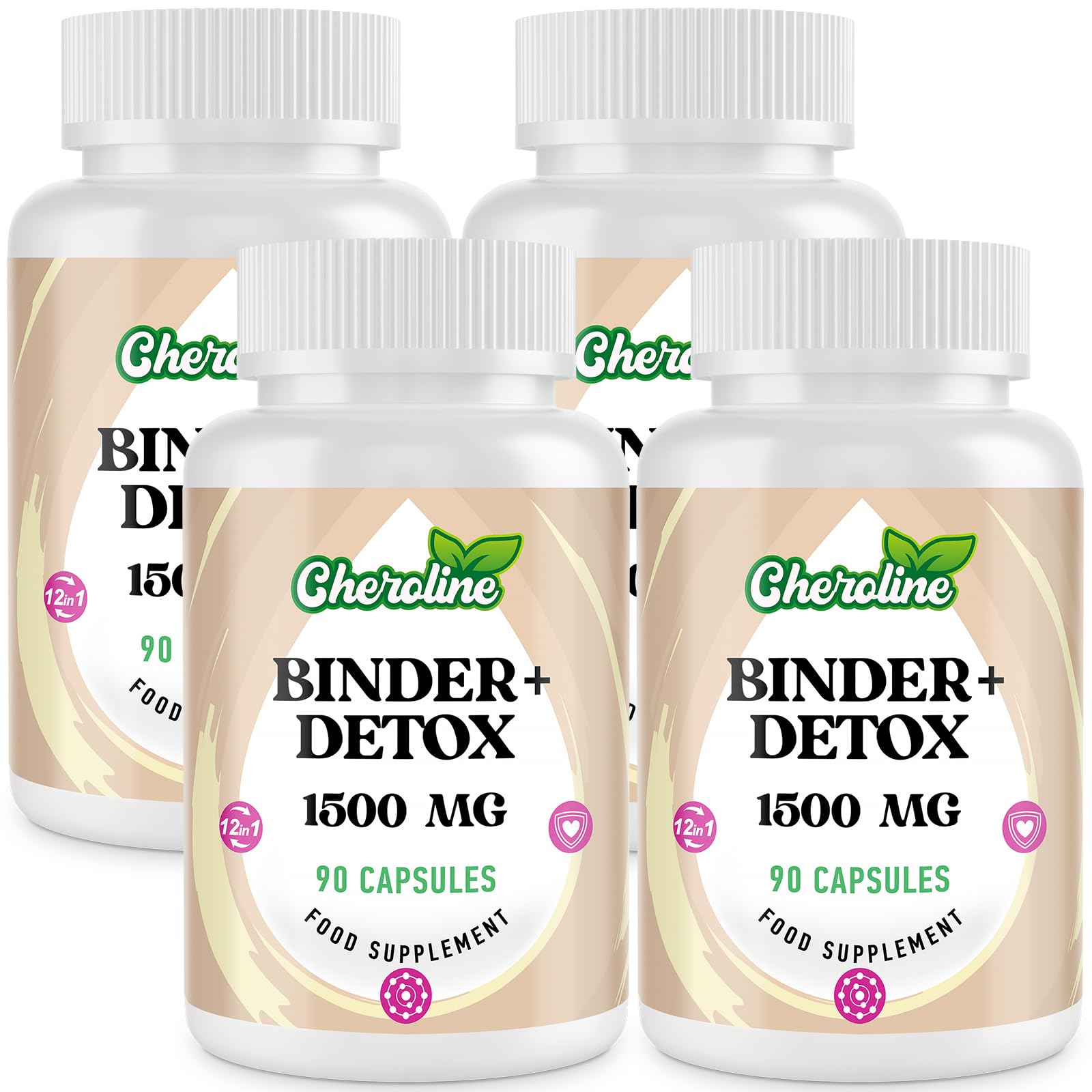 Cheroline Binder Detox Capsules 1500mg, with Activated Charcoal for Toxins, 12 in 1 Liver Gut Detox for Digestive & Bloating Relief, 90 Vegan Capsules (90 Count (Pack of 4))