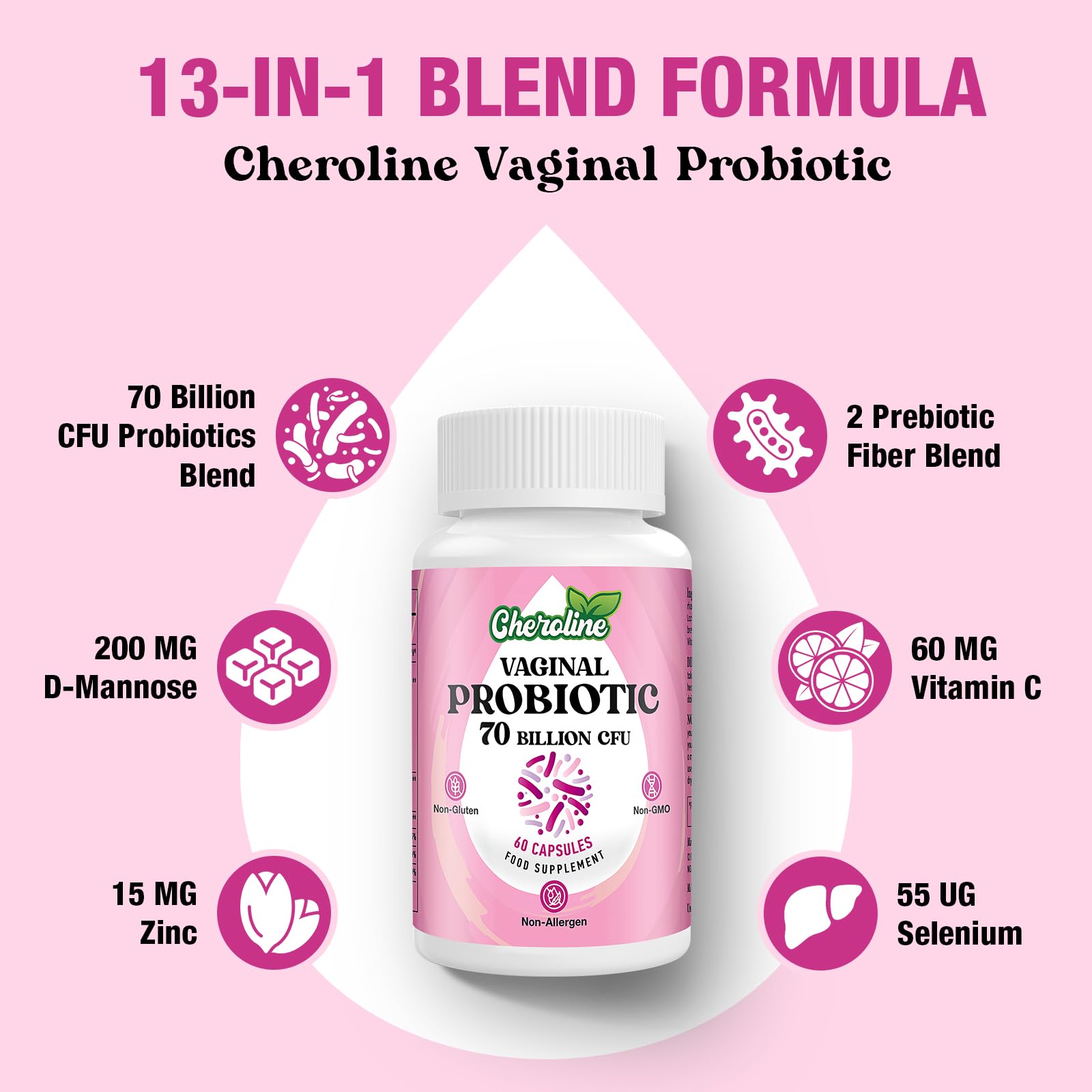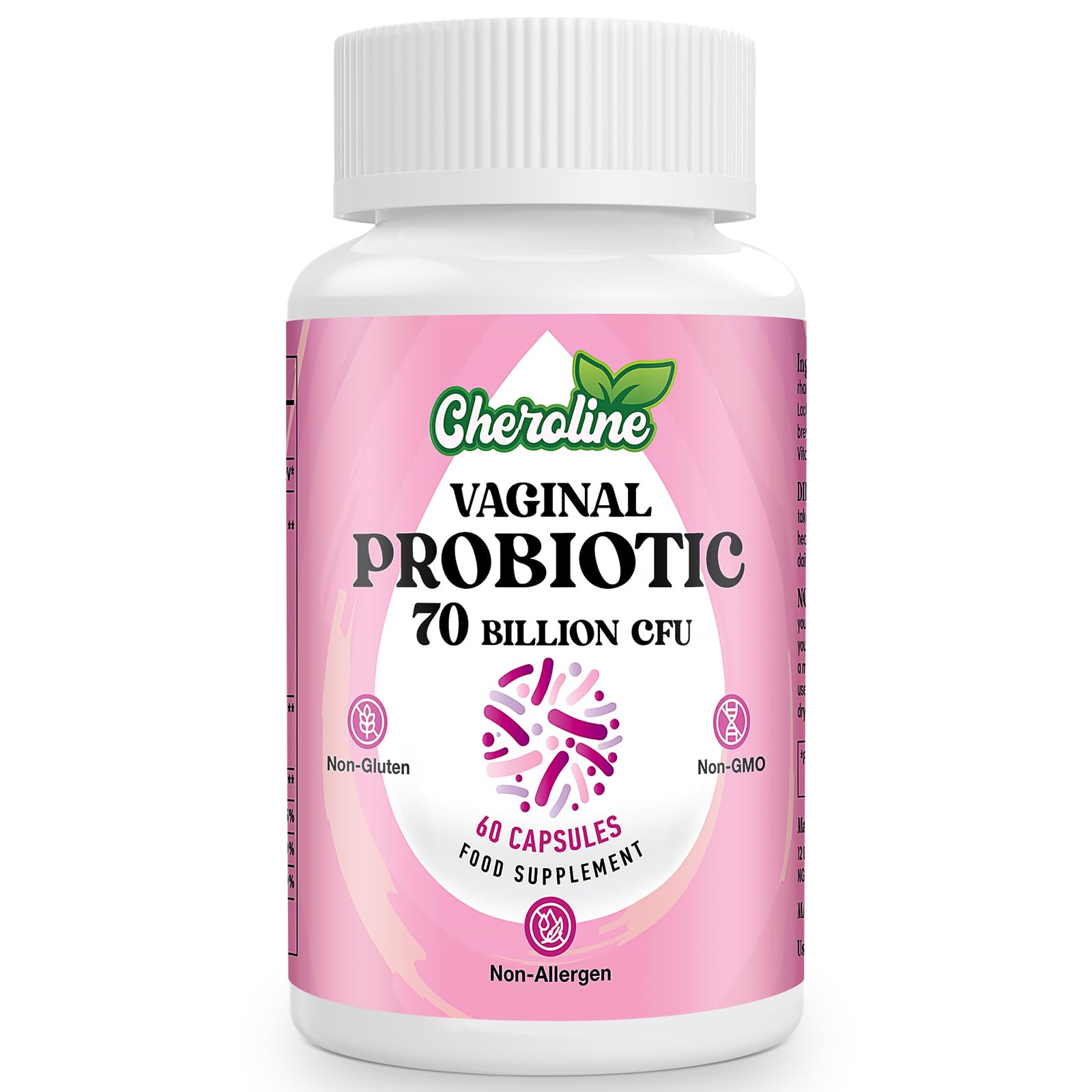 Cheroline Vaginal Probiotics for Women, 70 Billion CFU, 7 Strains with Prebiotic Blend, 13-in-1 Probiotic for PH Balance, Vaginal, Urinary & Immune Health, 60 Vegan Capsules (60 Count (Pack of 1))