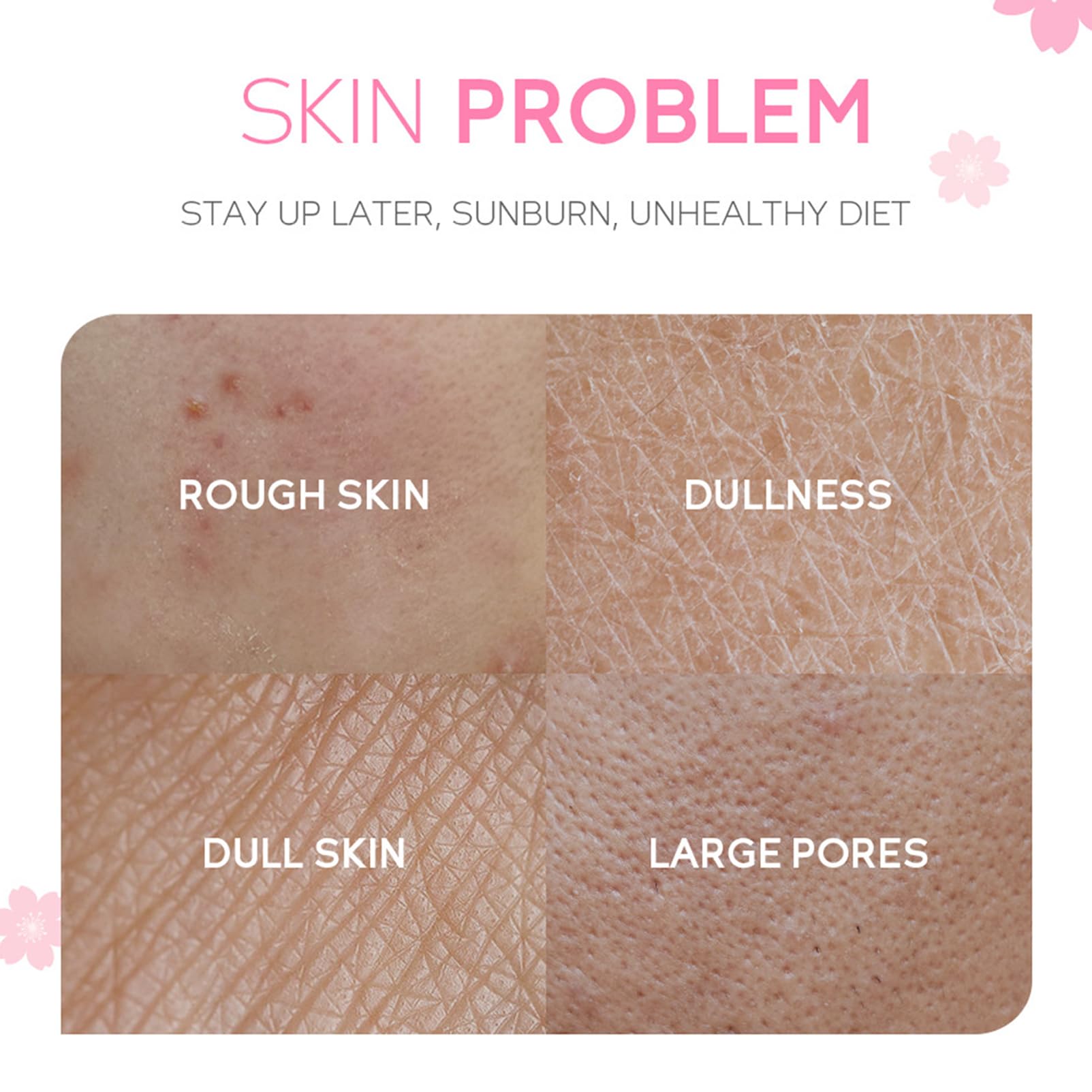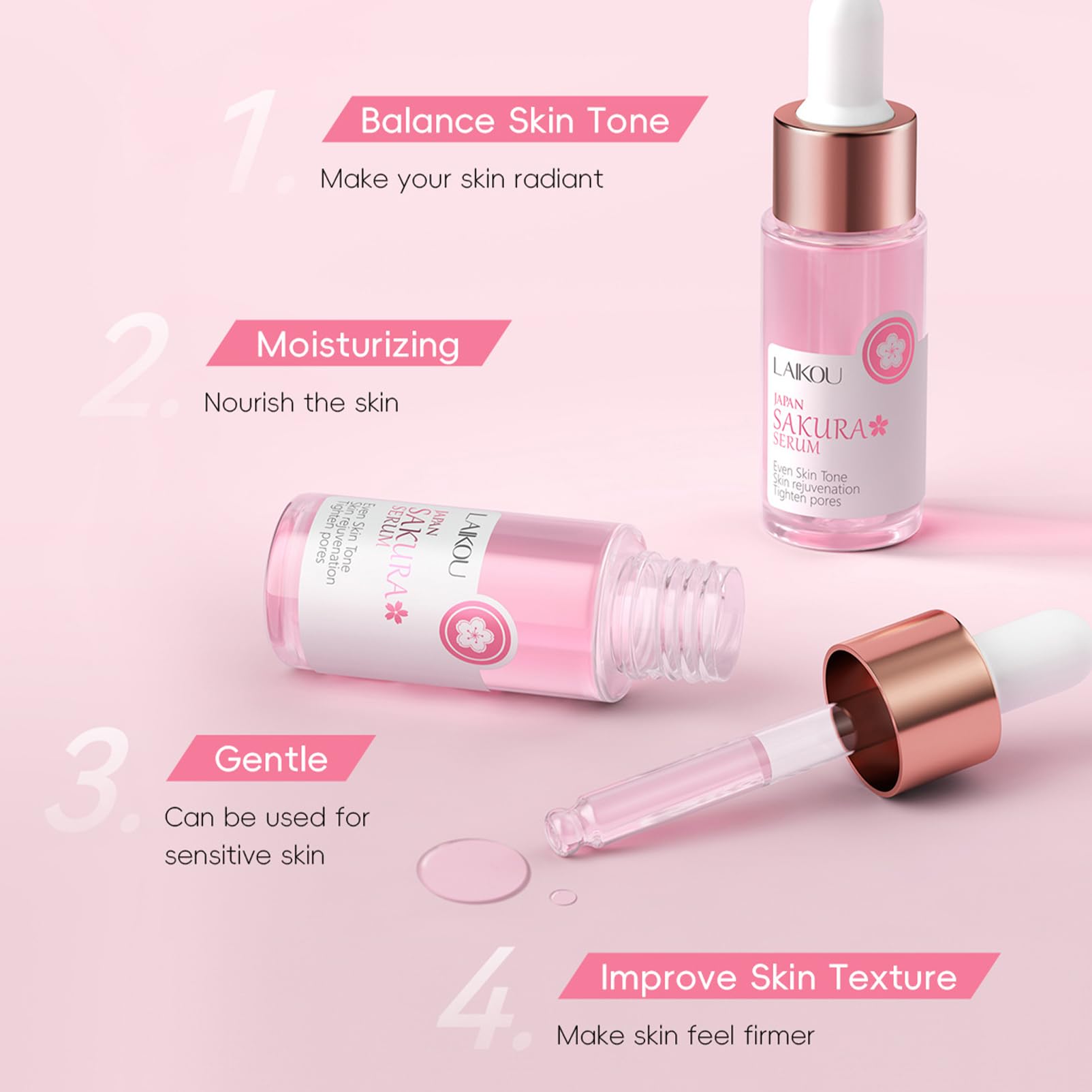 Luxurious all in one skincare set infused with natural Cherry Blossom extract and other plant essences to deeply moisturize and repair damaged skin while minimizing wrinkles, spots, and pores for a dewy, youthful glow.