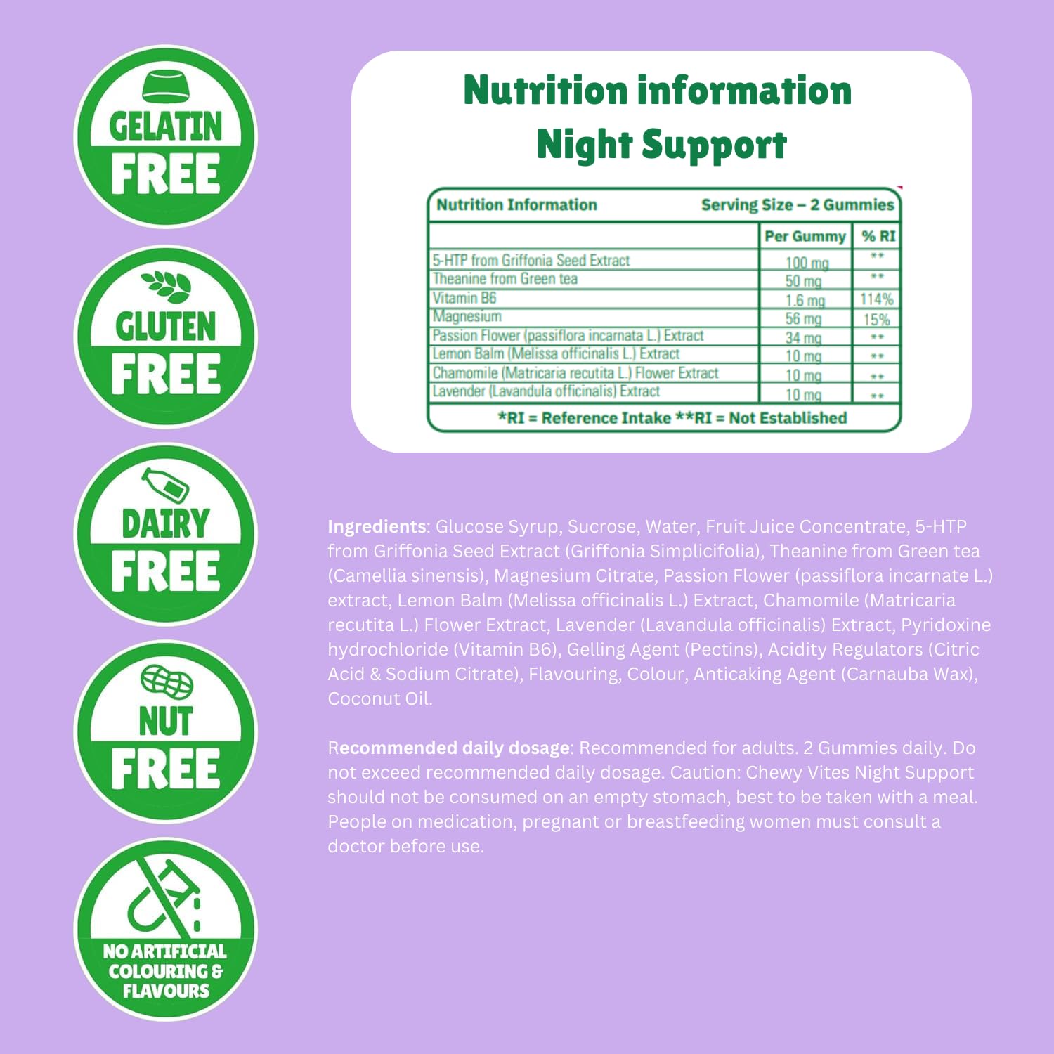 - TAKE BEFORE BEDTIME: Quality sleep is essential for optimal brain and body function, but modern life can often disrupt our natural sleep patterns. Sleep disturbances can lead to daily stress and fatigue. Our Night Support gummies are crafted with a unique blend of natural herbs, including Griffonia Seed, Theanin, Chamomile, Lavender, and Passion Flower. As you drift off, our bioavailable Magnesium works to reduce tiredness and fatigue, while Vitamin B6 supports healthy energy metabolism and psychological well-being (EFSA). Start tomorrow right with Chewy Vites Night Support.