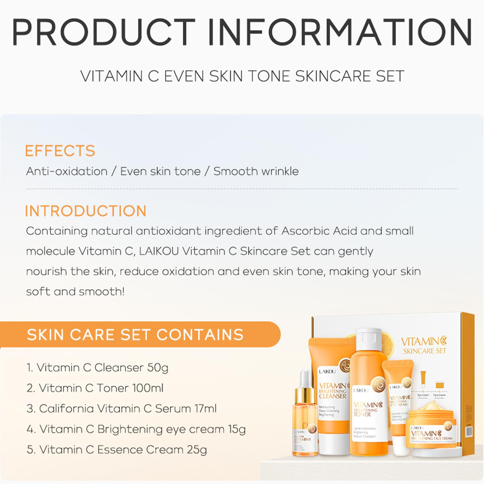 EFFECTS:Anti-oxidation/Brightening/Lighten blemishes INTRODUCTION:Vitamin C Brightening Skincare Set can gently nourish the skin, reduce oxidation and brighten skin tone, making your skin bright and smooth!