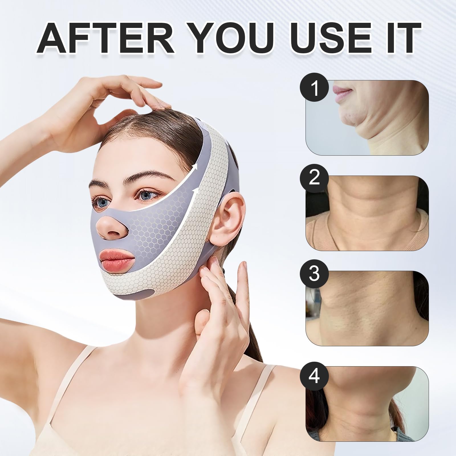 - Use chin lift mask for 2 hours a day to see the effect of skin firming and anti-wrinkle.