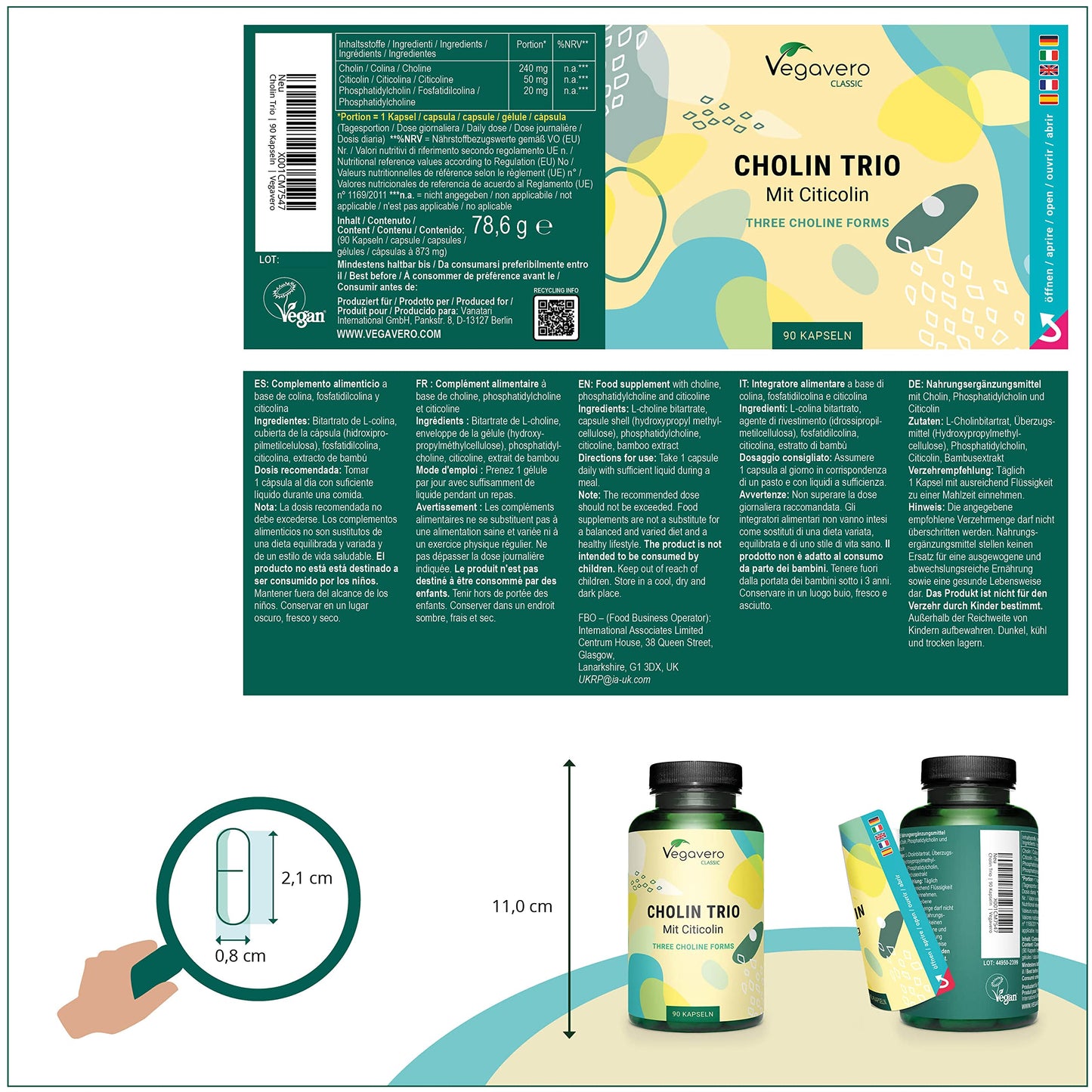 - ✅ VEGAN & OPTIMALLY DOSED: Choline is also a natural component of different foods. That is why our capsules provide approx. 250 mg of choline to not go beyond the recommended daily dosage while still contributing to an adequate intake. Our choline supplement is vegan and thus an ideal alternative to other tablets with animal-based gelatine. Of course, it's free from additives and non-GMO. Per bottle: 90 capsules. Recommended dosage: 1 capsule per day with plenty of water.