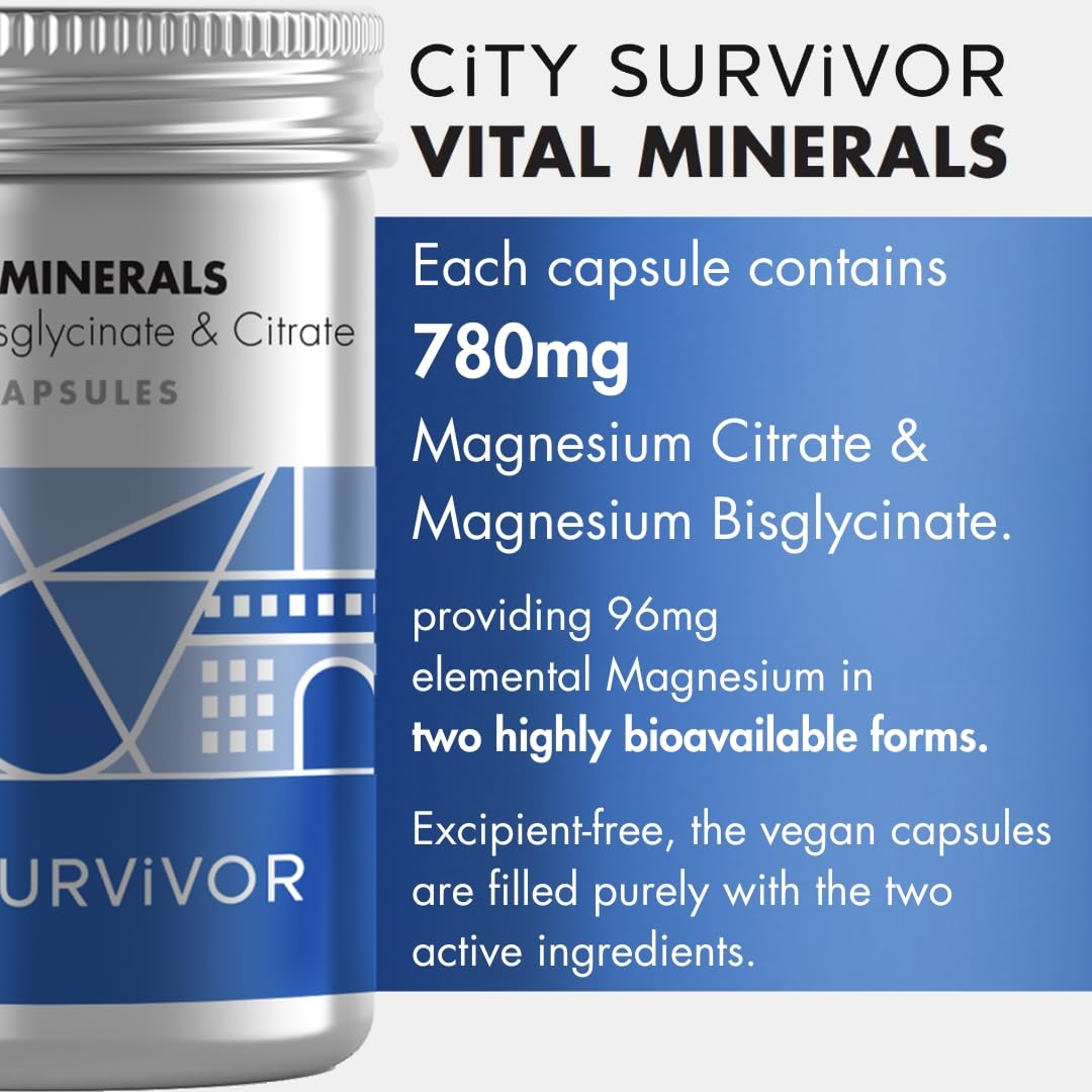 City Survivor Vital Minerals Magnesium - Bioavailable Glycinate & Citrate for Sleep, Energy and Exercise - 60 Capsules