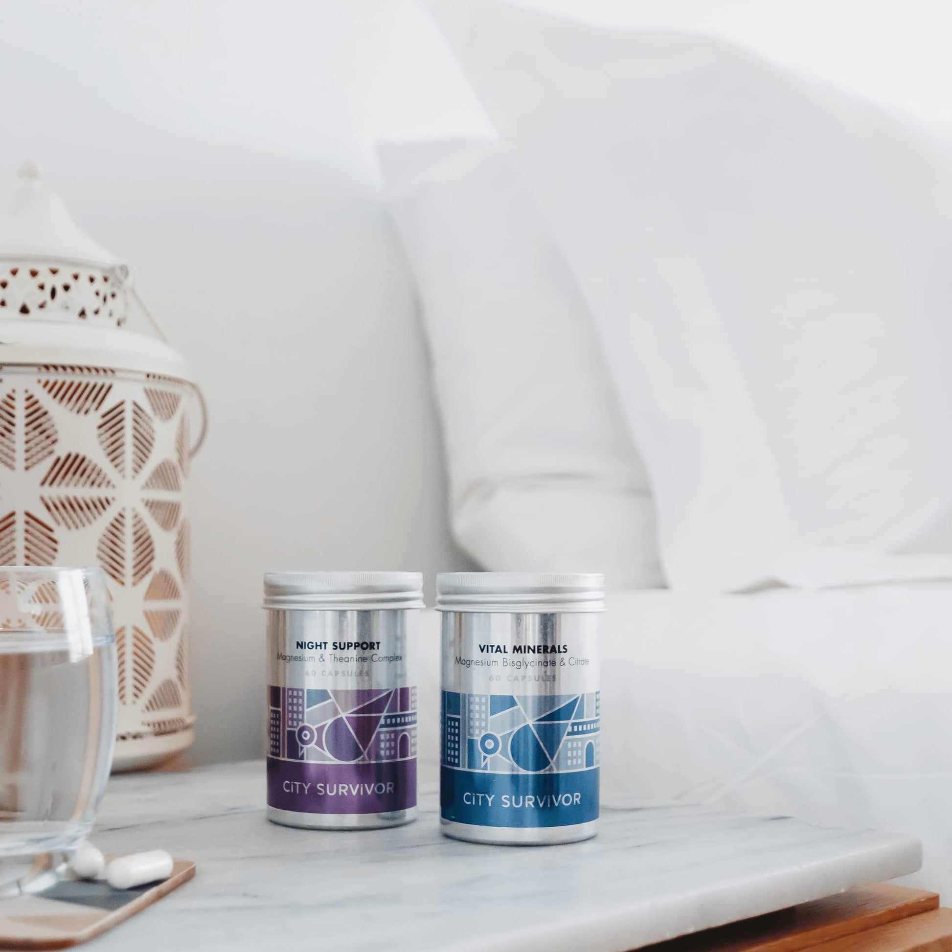 Magnesium is an essential nutrition supplement for stress management, sleep, and muscle relaxation. We use magnesium up more quickly when stressed, so it’s important to replenish with supplements and wholefoods. Magnesium tablets often contain bulking agents, anti-caking agents, glazing agents, emulsifiers and colours. In contrast, City Survivor vegetarian capsules are pure, filled only with the active ingredients magnesium citrate and magnesium glycinate. These types of magnesium are well-absorbed and don’t upset your gut. We never use the poorly absorbed oxide form. Magnesium is important for your nervous system, and for normal psychological function. Magnesium also contributes to energy-yielding metabolism and helps reduce tiredness and fatigue. It’s important for its contribution to normal muscle function, so we particularly recommend Vital Minerals Magnesium if you exercise or suffer restlessness at night.More Info