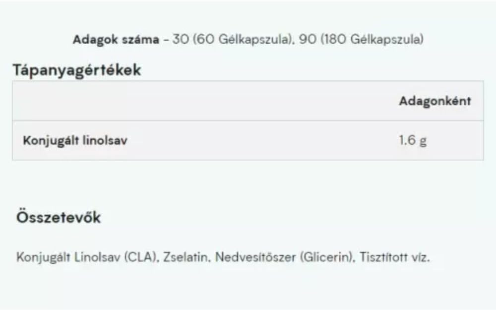 - Ingredients: conjugated linoleic acid, capsule( gelatin), humectant( glycerol), purified water