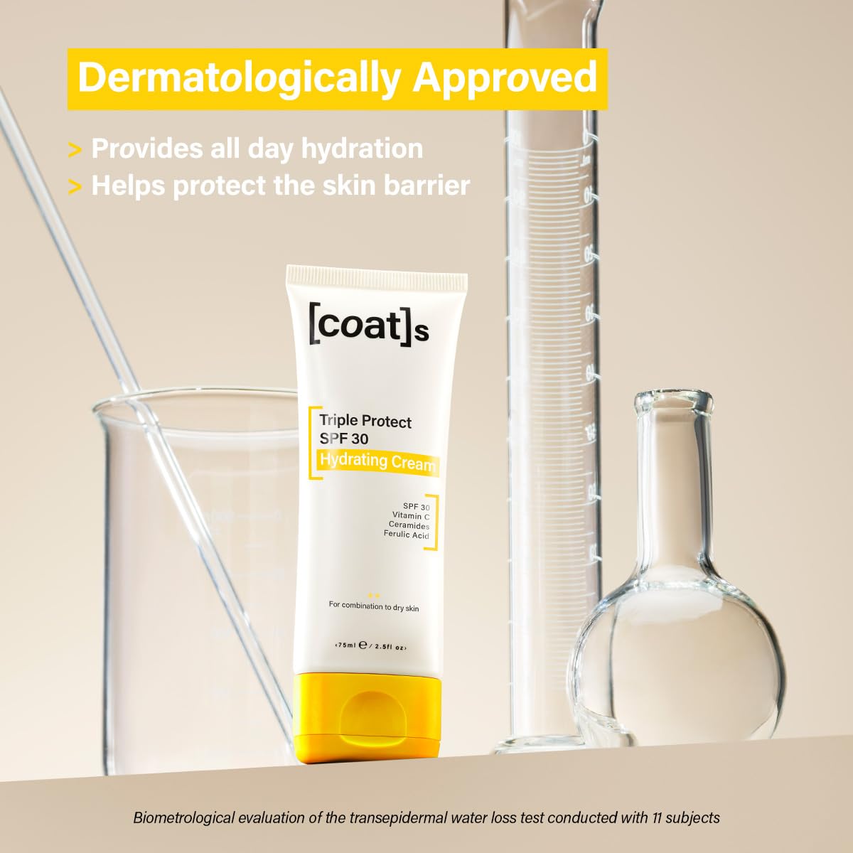 DERMATOLOGIST APPROVED SKINCARE. Clinically proven, skin-barrier protecting, breakout-preventing skincare. Developed by expert chemists. Approved by Dermatologists. Trialled by you. Coats Triple Protect SPF 30 Hydrating Face Cream [PROtect] - SKIN BARRIER: Hydrating Complex: Ceramides + Panthenol + Centella Asiatica [PREvent] - PREMATURE AGING: Triple Protecting Complex: SPF 30 + Ferulic Acid + Vitamin C [PREvent] - BREAKOUTS: Non-comedogenic SPF system HOW TO USE: The fourth step in the Coats Skinsentials skin routine. Start your daily routine with our Gentle Hydrating Cleanser, follow with our Gentle Hydrating Toning Milk and Triple Moisture Water Cream, then finish with our Triple Protect SPF 30 Hydrating Cream. Coats Skincare: designed to keep your skin healthy now and in the futureMore Info