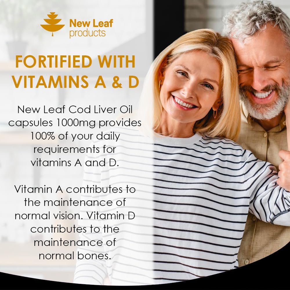 New Leaf's Cod Liver Oil Soft gel Capsules are manufactured under the strictest standards following UK's GMP (Good Manufacturing Practice). We provide outstanding value and premium quality health supplements to help you live a more vibrant life. Each product in our Health Supplement range is packed with nutrients to boost your body's defence system and give you the energy to do more, achieve more, and dream more. WITH VITAMIN A & D: Our Cod Liver Oil Capsules are a source of vitamin A and D (in the most beneficial, natural D3 form). With 2664iu of vitamin A and 200iu of vitamin D3, our Cod Liver Capsules contribute to your daily vitamin requirements HEALTH BENEFITS: The health benefits of fish oils are well known, with EPA and DHA supporting heart and brain health, normal vision and blood pressure. Vitamin A supports normal vision, and Vitamin D supports the normal function of the immune systemMore Info