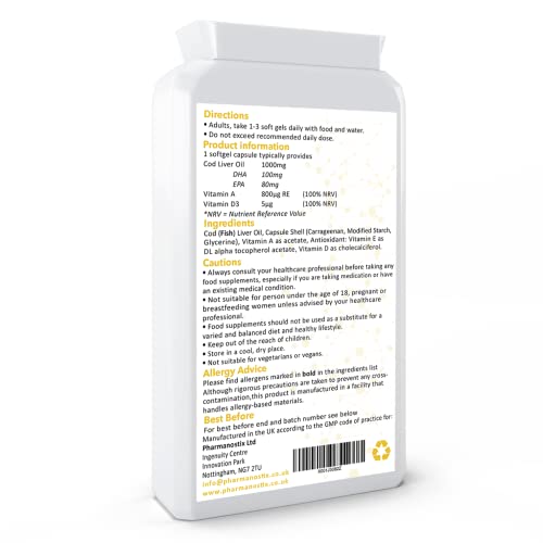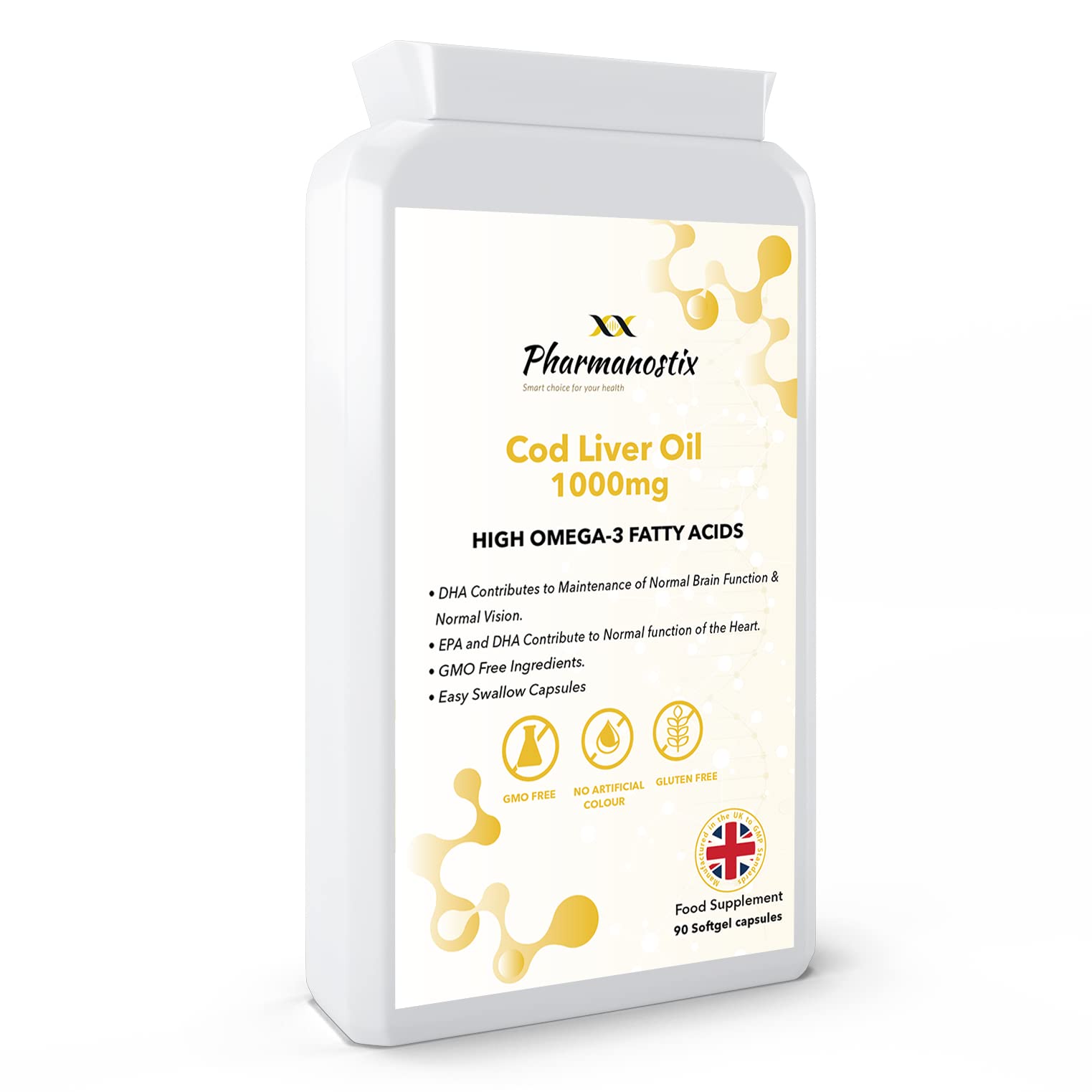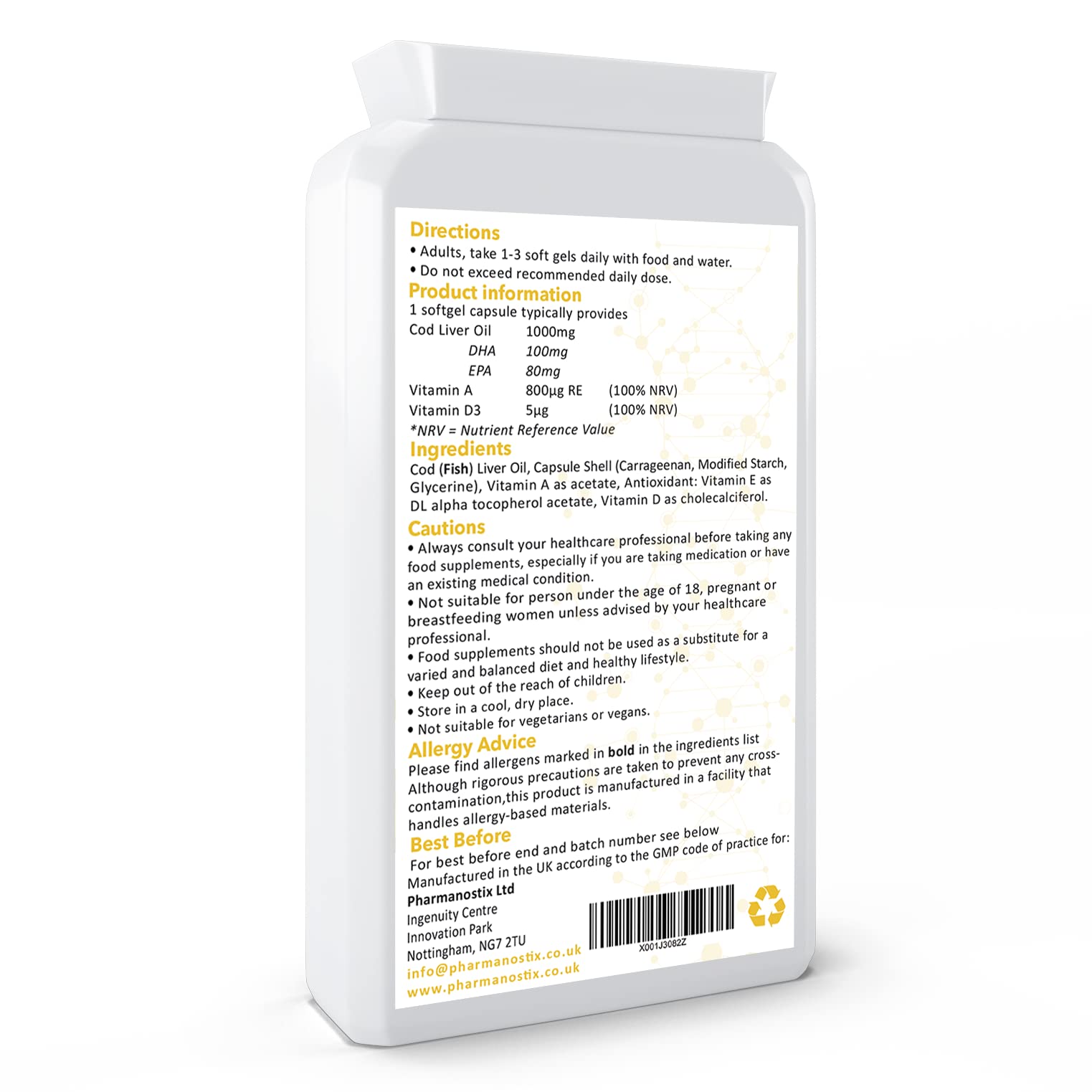 Cod Liver Oil Supplement (1000mg) - 90 Soft Gel Capsules-Daily Omega 3 Supplement with DHA and EPA Essential Fatty Acids- Enriched with Vitamins A and D-Pharmanostix