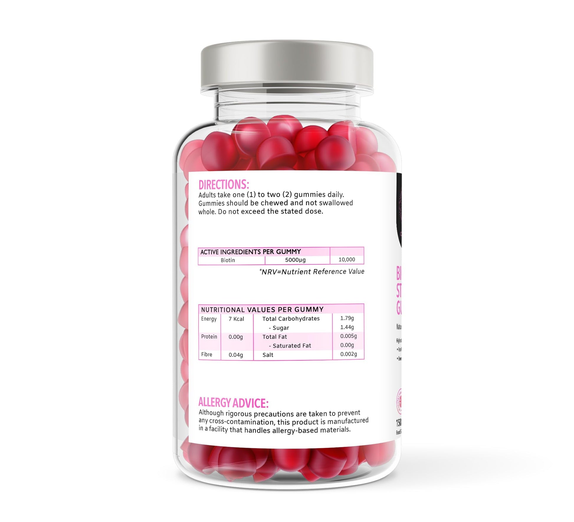COGNIHAX STRAWBERRY FLAVOUR BIOTIN GUMMIESStrong Biotin Strawberry gummies. Boost the health of your hair and skin with the 150 Biotin Strawberry flavour gummies. COGNIHAX STRAWBERRY FLAVOUR BIOTIN GUMMIES: Enhance your beauty and wellness routine with our premium biotin gummies, formulated for both women and men. Each serving delivers a potent 5000mcg of biotin (Vitamin B7), supporting hair, skin, and nail health. Our delicious, chewable gummies offer a convenient alternative to traditional tablets or capsules. With 150 gummies per bottle, enjoy a 2-month supply of high-strength biotin to help you look and feel your best every day. Perfect for daily health support and rejuvenation." These vegan-friendly gummies are packed with natural strawberry flavour and high strength biotin for maximum results in both energy and metabolism. Try them now and see the difference! FOR RADIANT SKIN, HAIR & NAILS: Biotin (Vitamin B7) is a vital nutrient for maintaining healthy skin and hair. It supports normal hair growth, skin health, and contributes to energy metabolism and nervous system function. Additionally, selenium promotes strong, healthy nails (EFSA Approved Claims). Instead of taking multiple supplements, enjoy the full benefits of our tasty, chewable biotin gummies, designed to support your beauty and wellness needs in one easy step." Adults take one (1) to two (2) gummies daily. Gummies should be chewed not swallowed whole.More Info