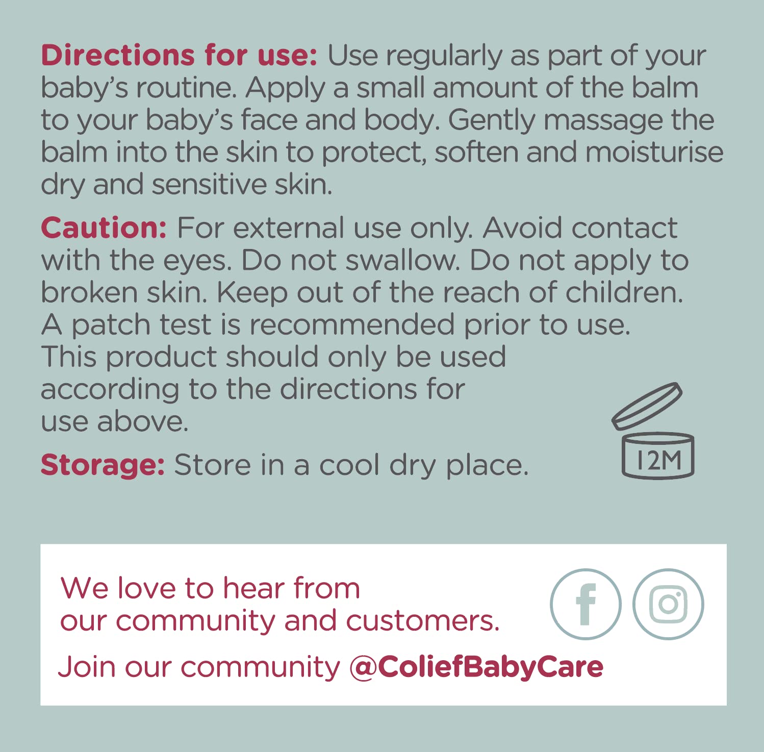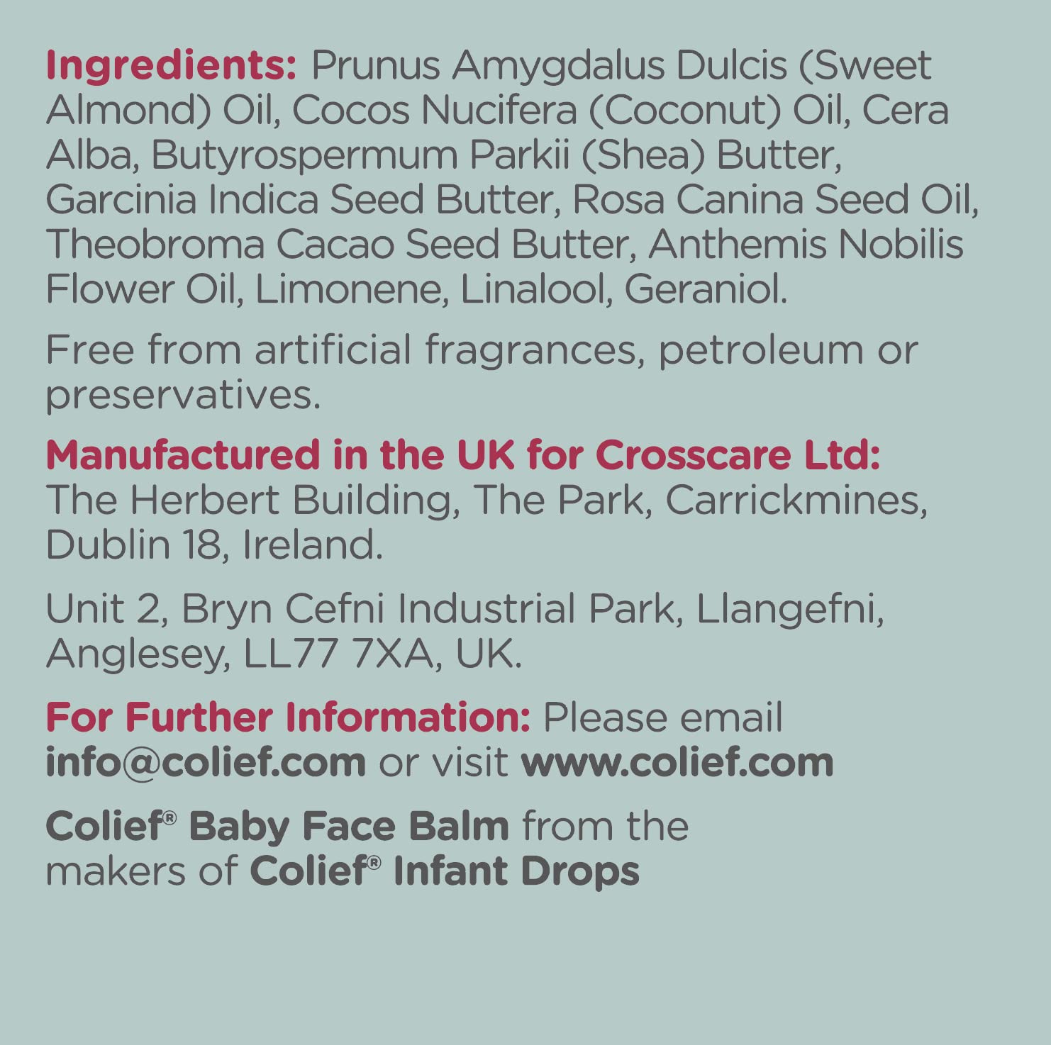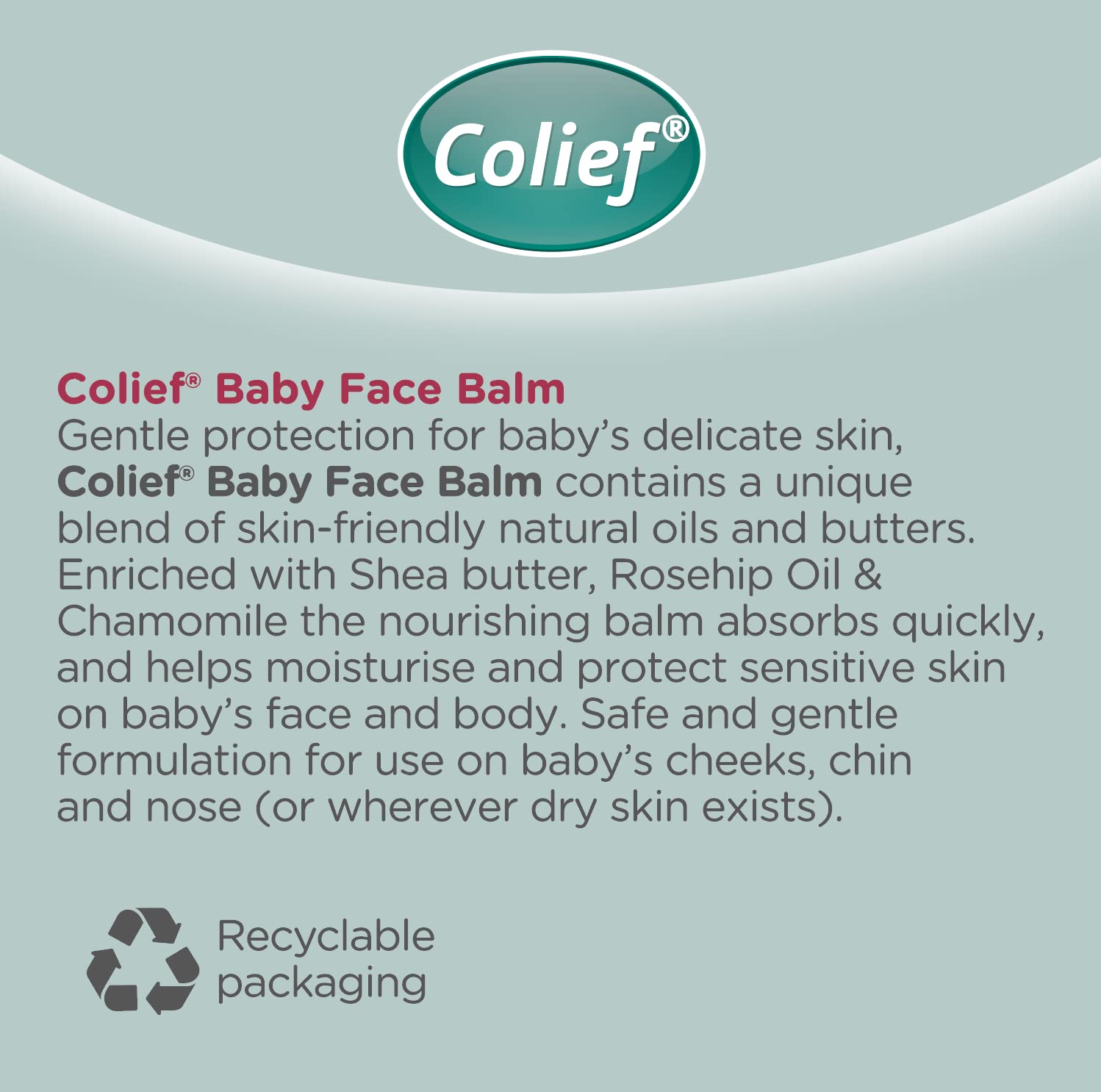 - FREE FROM- Artificial fragrances, petroleum or preservatives and not tested on animals.COVENIENT FORMAT – Colief Baby Face Balm comes in a small and light 50g aluminium tin, a must-have for any mother’s diaper bag, easy to carry and apply on the go. The packaging is fully recyclable.
