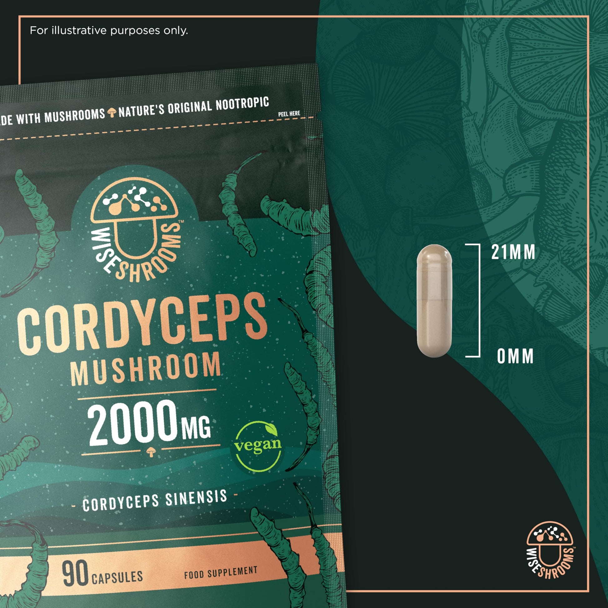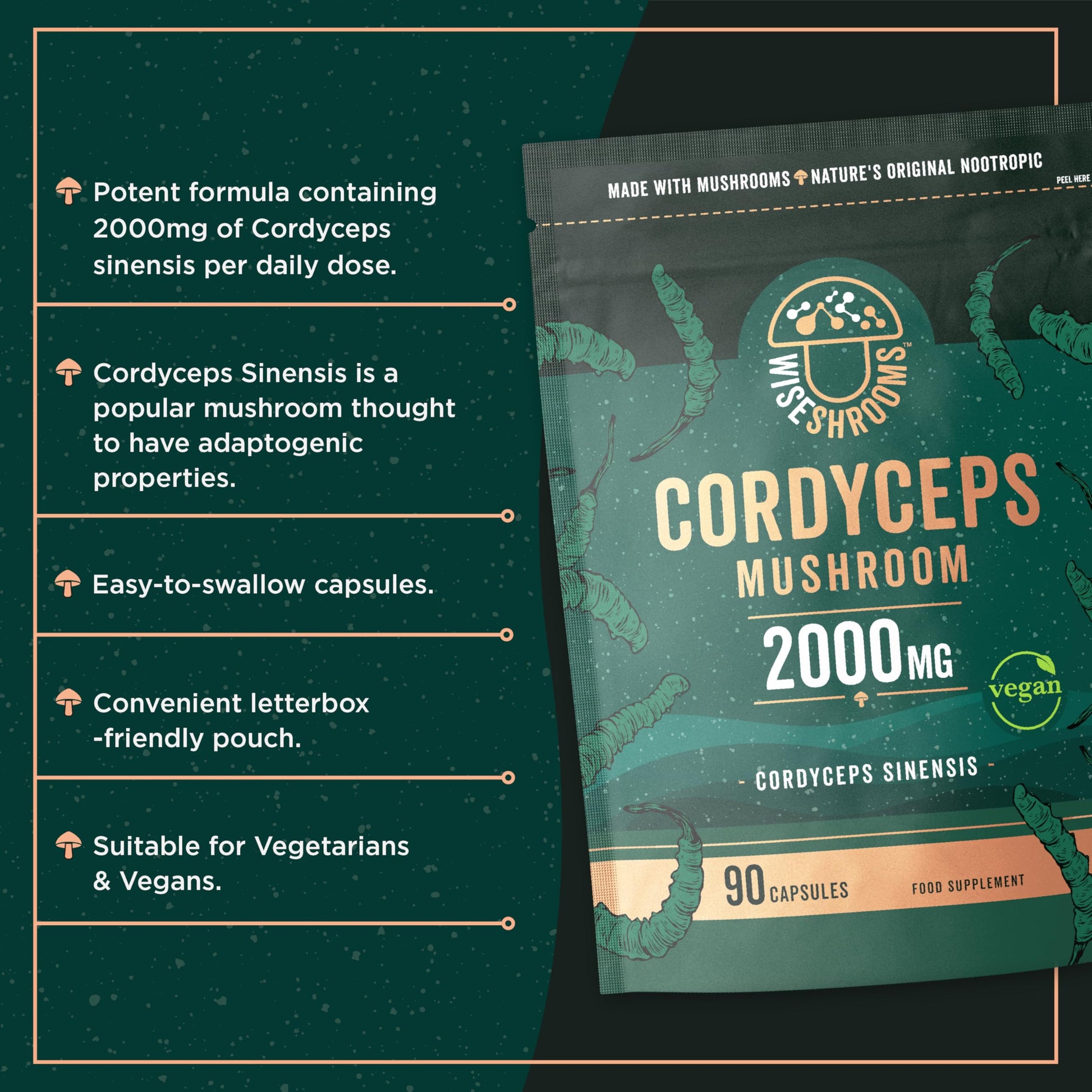 Cordyceps Capsules 2000mg | Cordyceps Mushroom Extract Supplement | 90 Capsules | Suitable for Vegetarians and Vegans | by Wiseshrooms