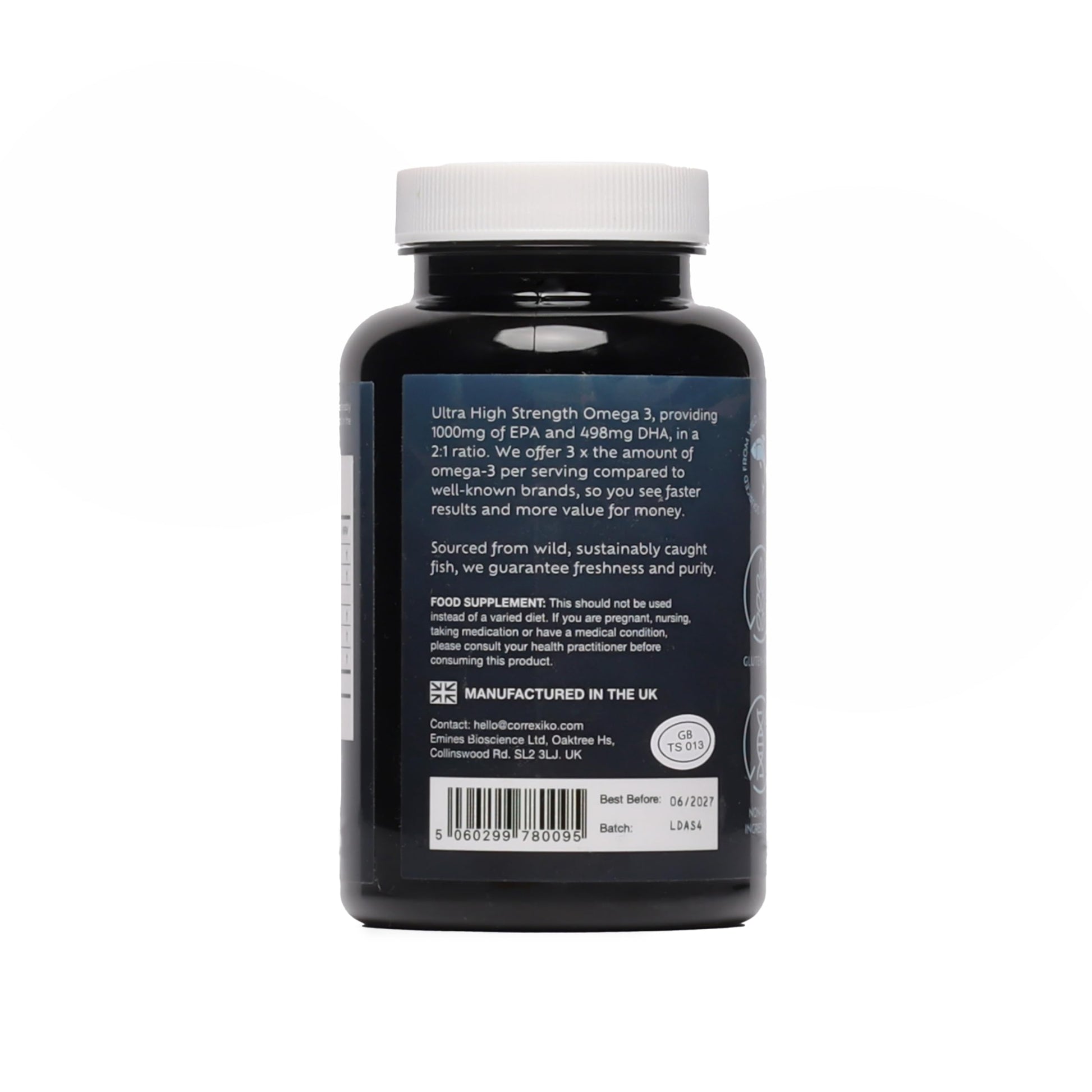 This bundle contains a 30 day supply of both Correxiko Marine Collagen capsules and high strength Ultra Omega 3 capsules. Omega 3 capsules, can help to reduce inflammation in the body, support brain health, joint health, promote healthier hair and aid hydration of the skin to combat fine lines and wrinkles. Correxiko Marine Collagen Peptides Capsules contain 2000mg of hydrolysed Marine Collagen per serving. These capsule contain added hyaluronic acid, vitamin C and the minerals zinc, manganese and selenium.More Info